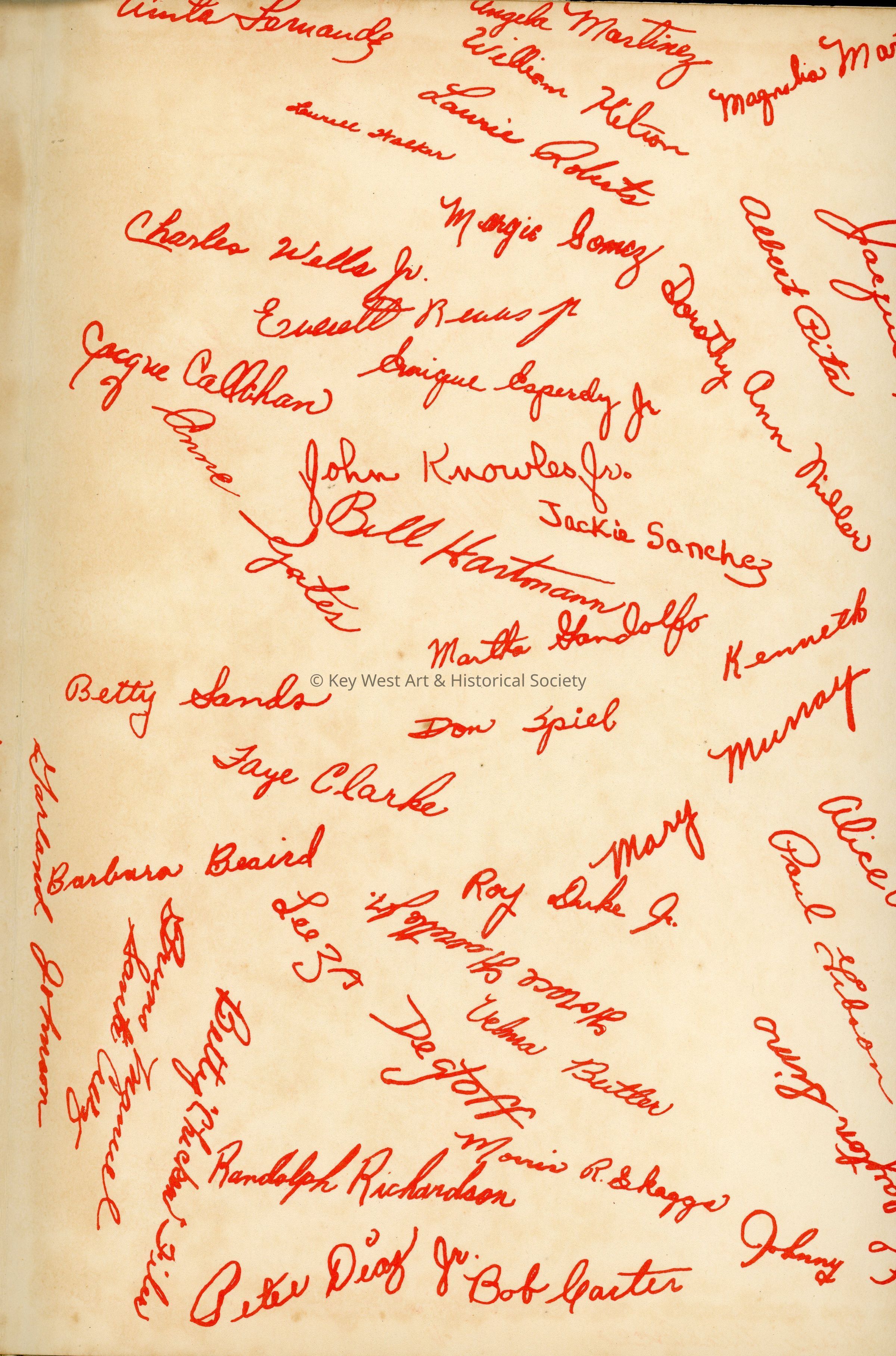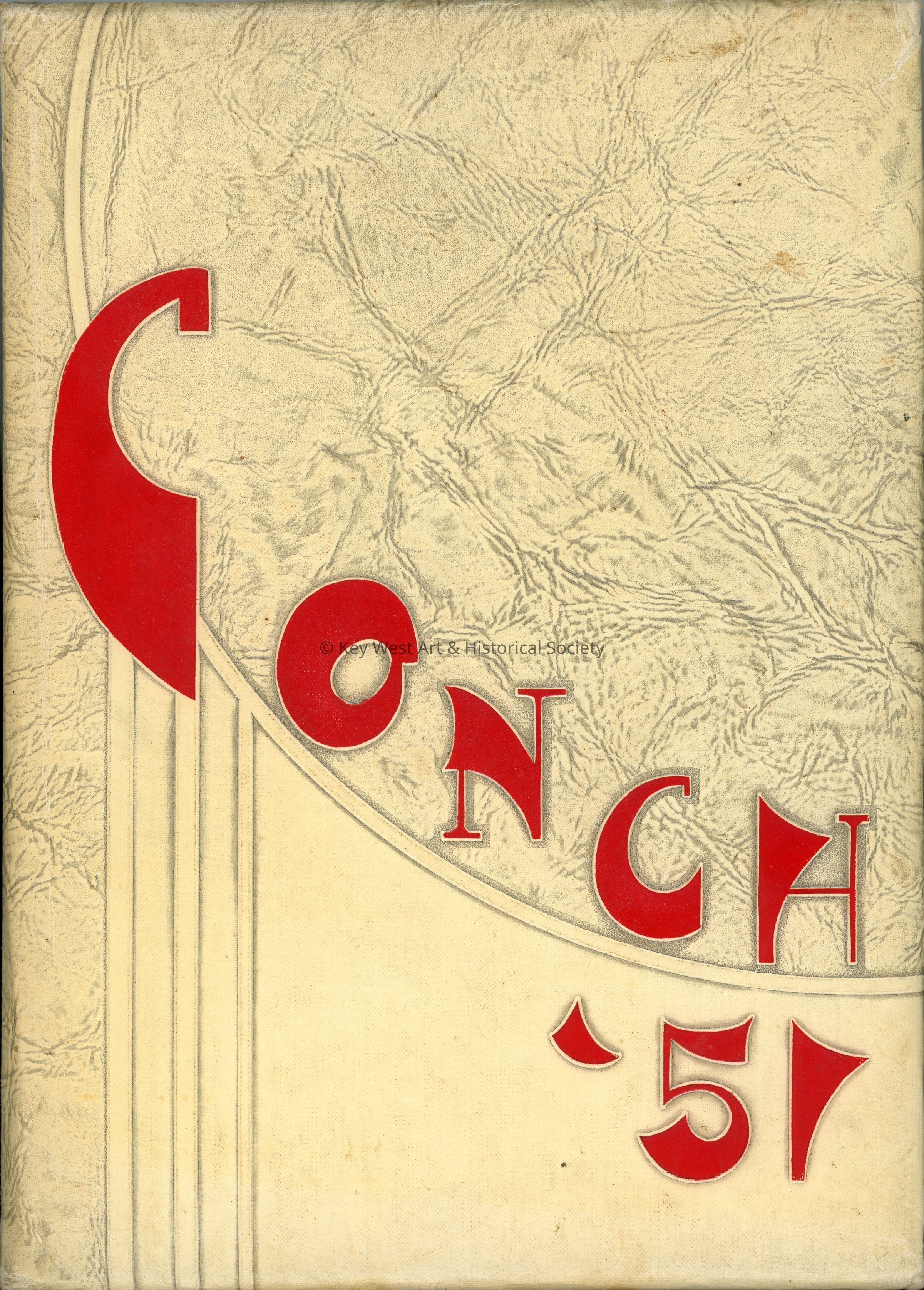 The 1951 edition of 'The Conch,' the Key West High School yearbook. The book has an off white cover with red text and the endpaper contains signatures of those in the graduating class.