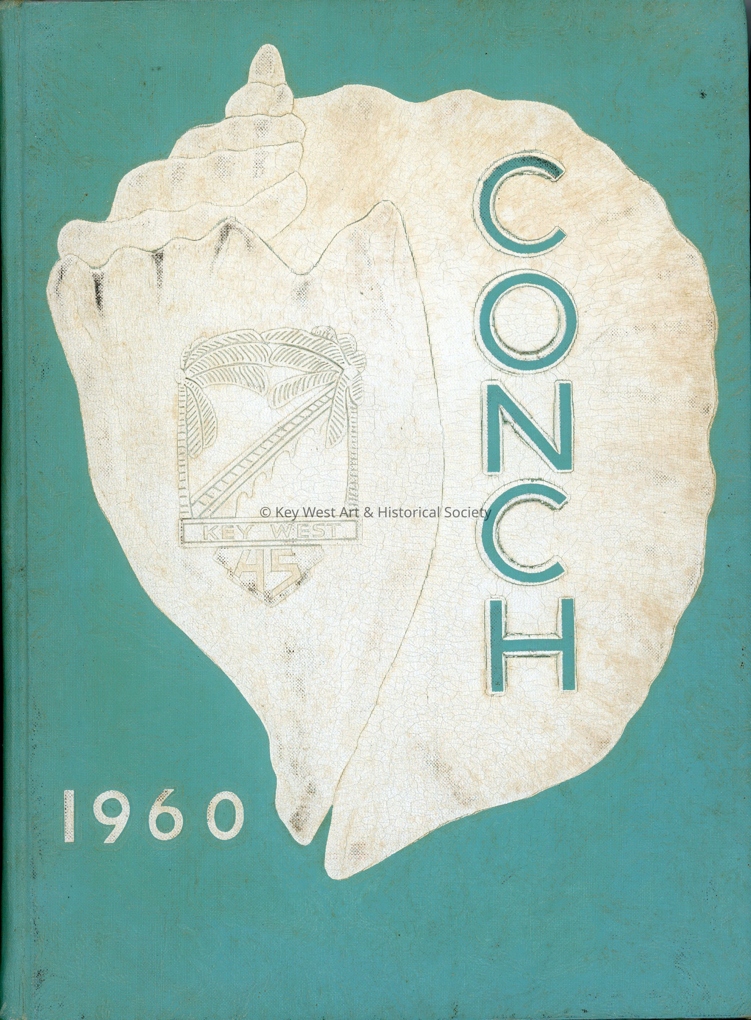 The 1960 edition of 'The Conch,' the Key West High School yearbook. The book has a teal blue cover with a large white conch shell bearing the school crest. Included in the back of the yearbook is a supplement for events that occurred after the book had been sent to the printer (2023.20.0043b).Collection