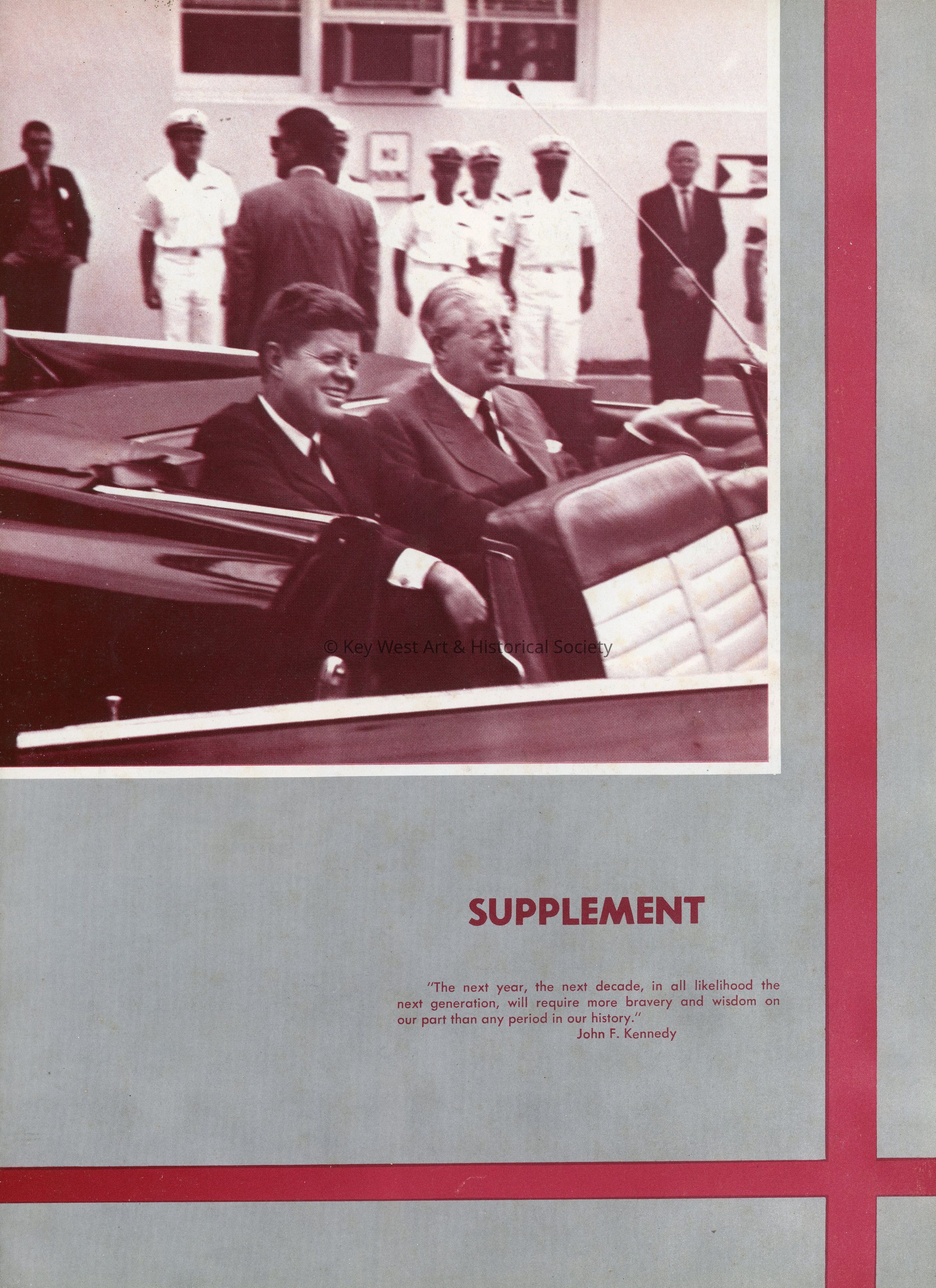 A supplemental insert for the 1961 edition of 'The Conch,' the Key West High School yearbook (2023.20.0044a). The cover of the insert is a black and white image of President John F. Kennedy and British Prime Minister Harold Macmillan in an open convertible in Naval Air Station Key West. The insert documents events that occurred after the yearbook had been sent to the printer.Collection