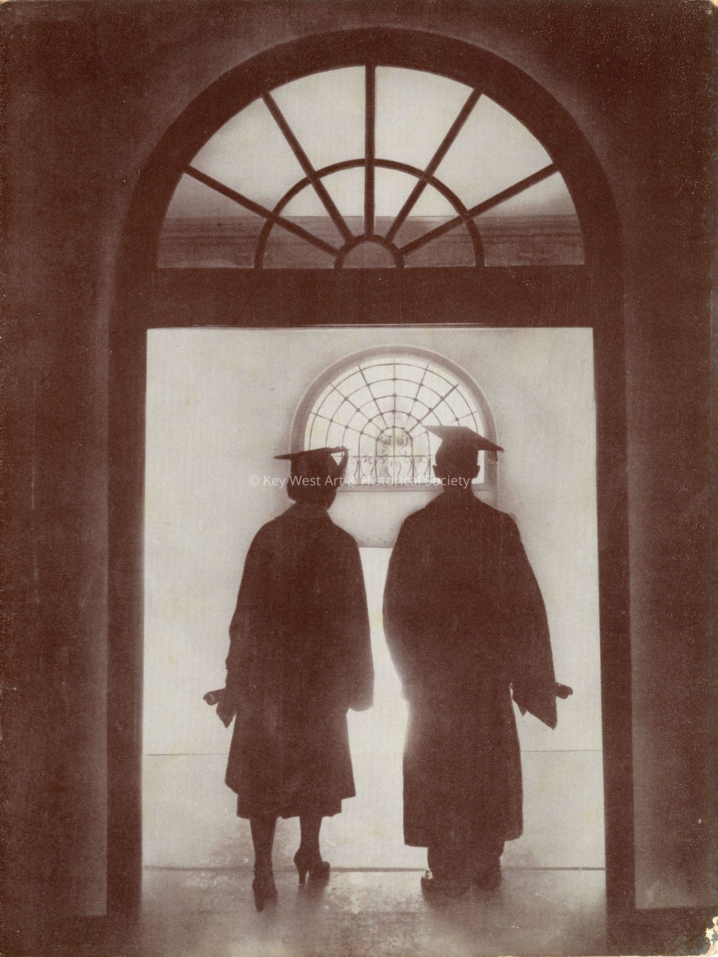 A supplemental insert for the 1953 edition of 'The Conch,' the Key West High School yearbook. The insert documents events that occurred after the yearbook had been sent to the printer. The cover of the insert shows two students, a young woman and a young man, walking through a doorway in commencement robes.Collection