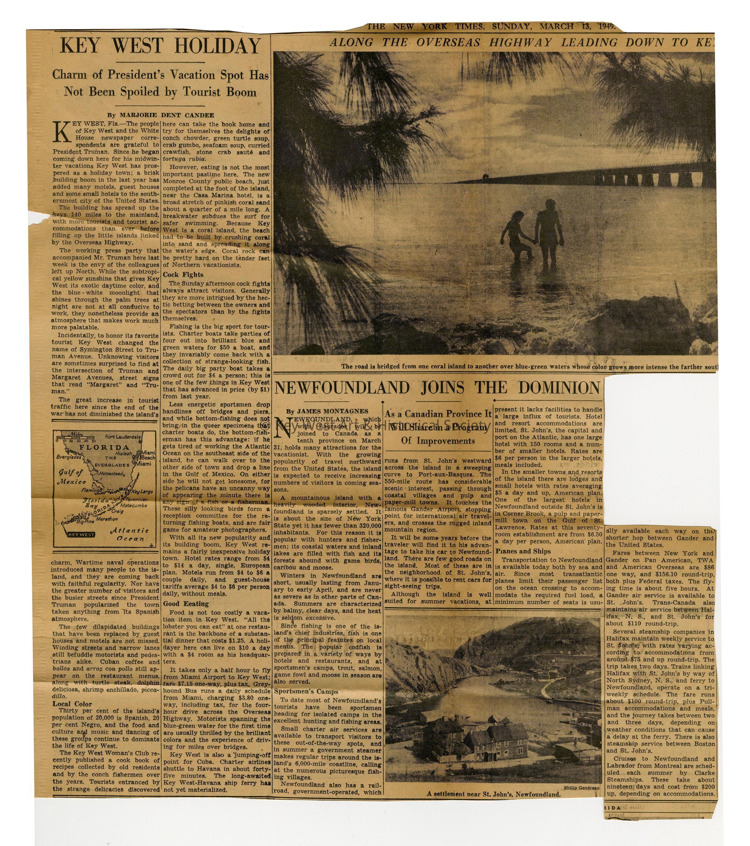 Newspaper clipping of an article from the New York Times entitled 'Key West Holiday'. The newspaper clipping was preserved by James Buckley. Buckley worked at Casa Marina during the winter of 1928-1929.