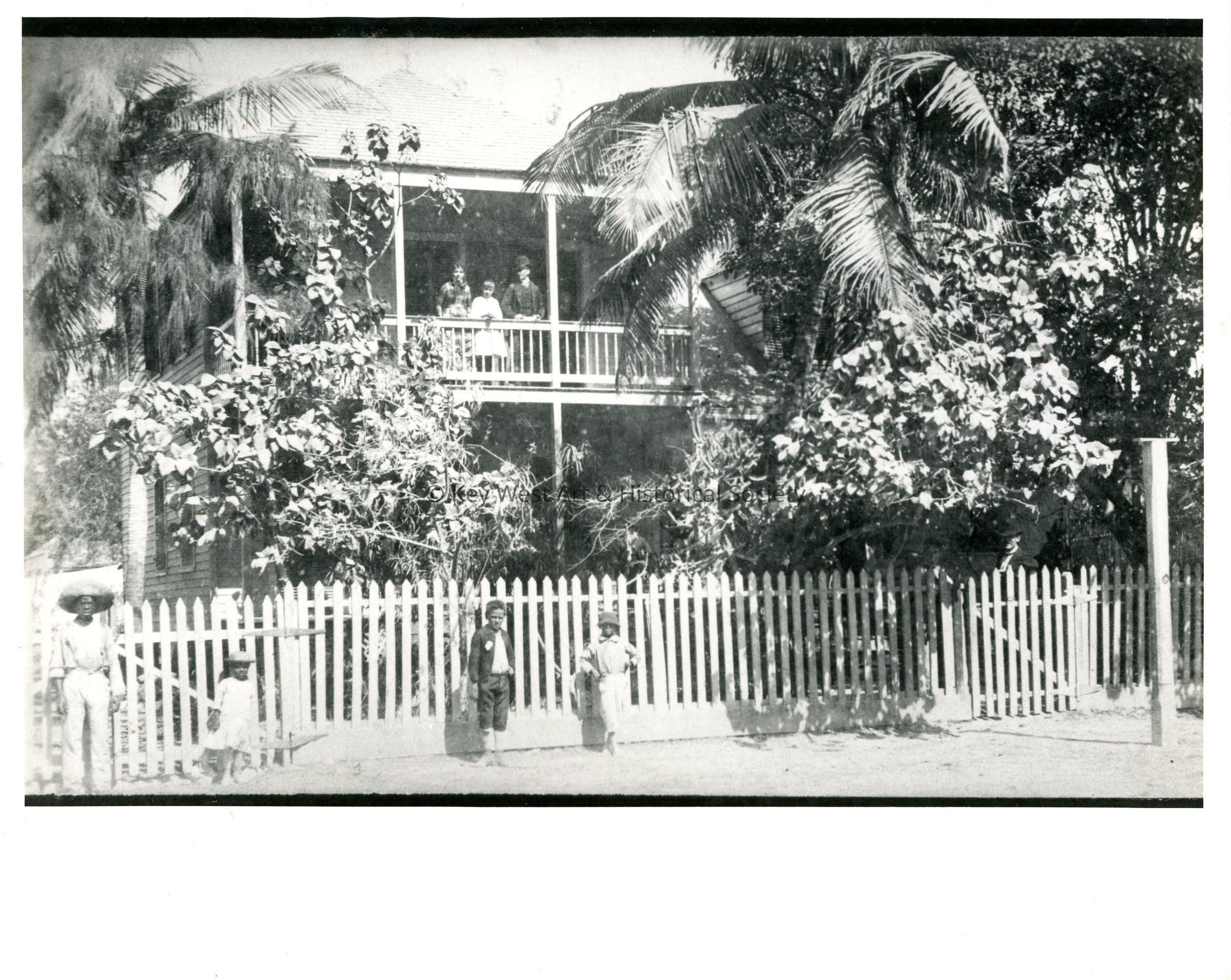 Black and white photograph of a neighborhood scene including a two story Conch House with a family standing on the second floor porch and young children outside the fence.