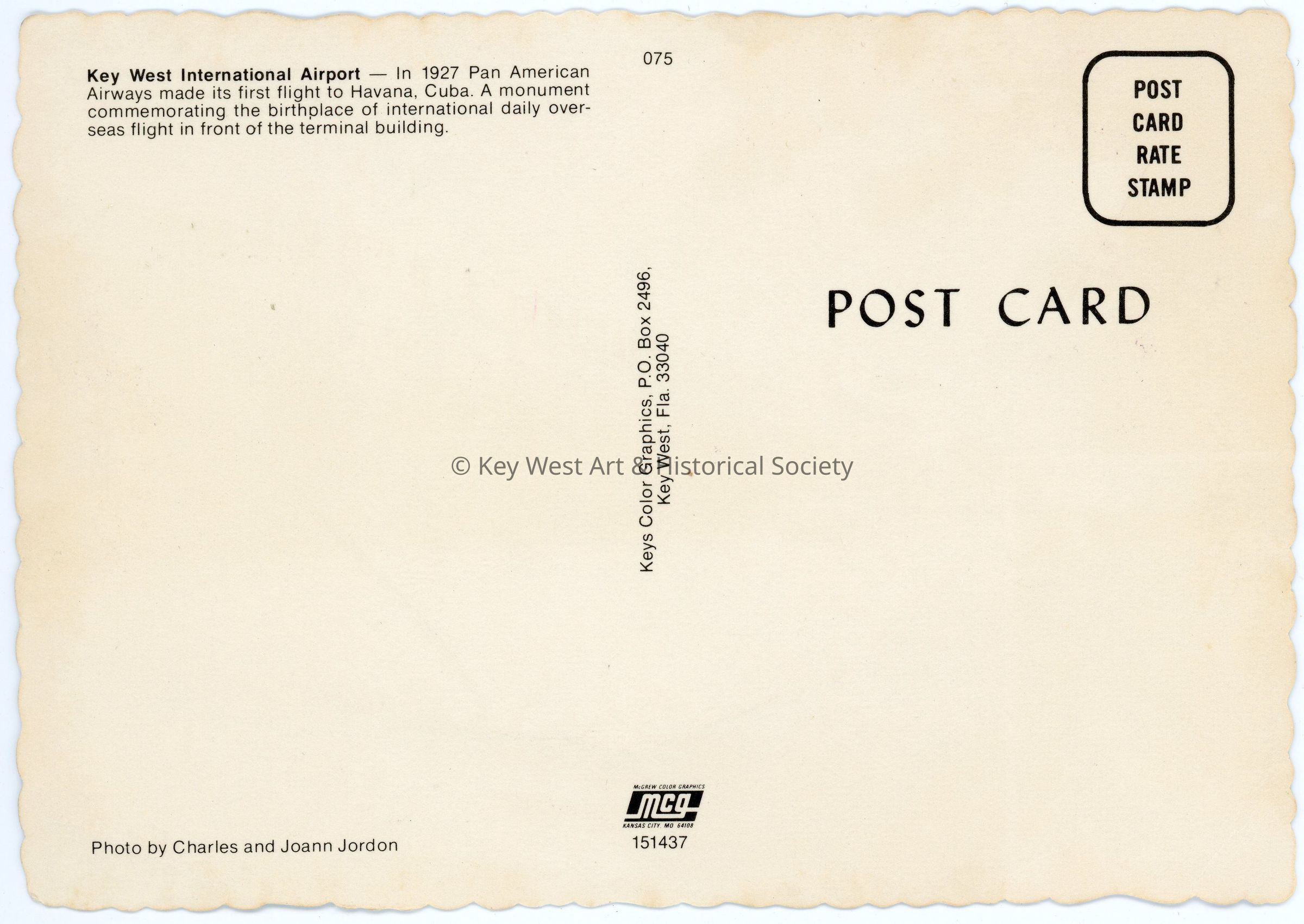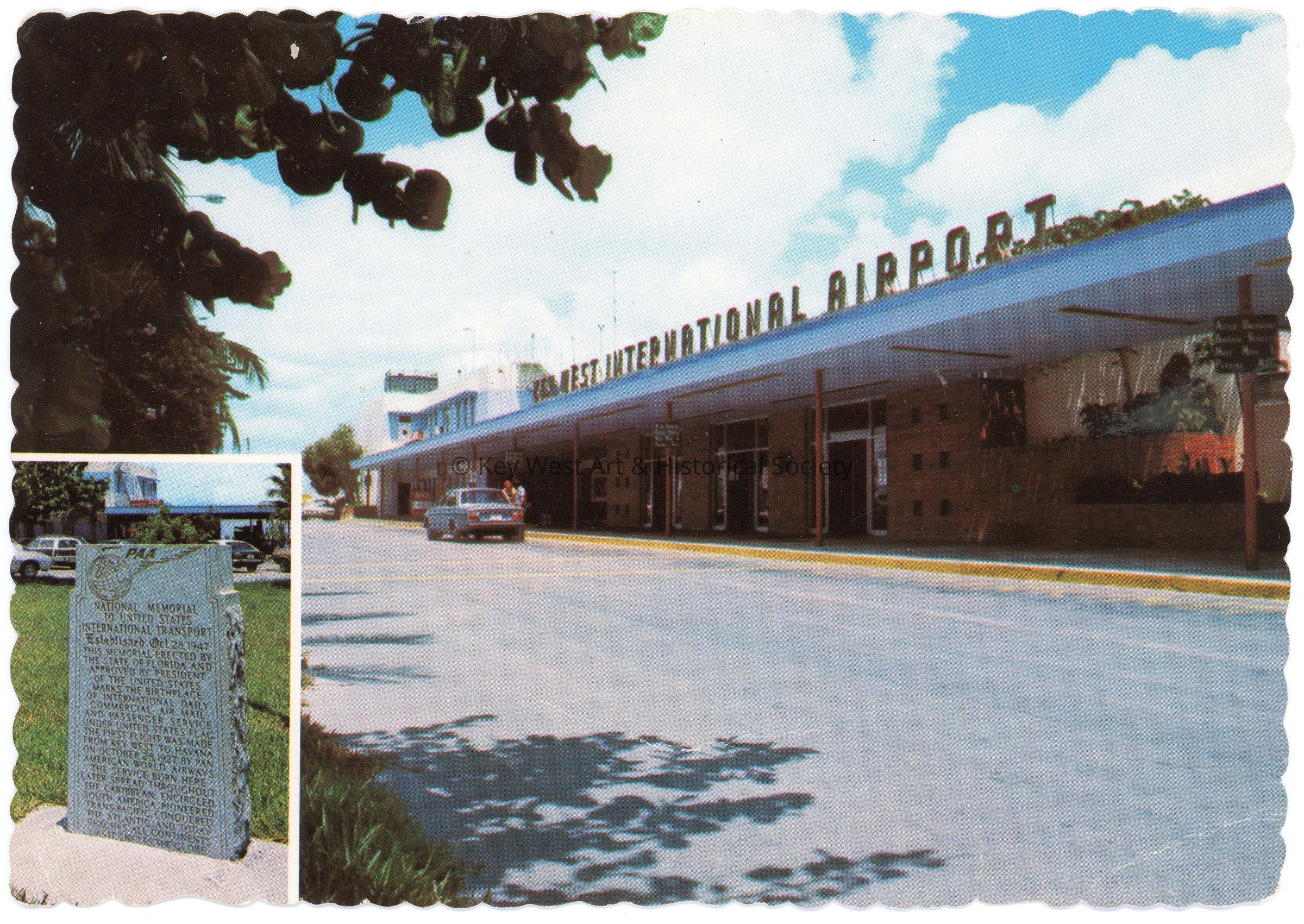 Scallop-edged postcard depicting the front of the Key West International Airport. An inset shows a monument to Key West's place in international travel history. Notation on verso 'In 1927 Pan American Airways made its first flight to Havana, Cuba. A monument commemorating the birthplace of international daily overseas flight in front of the terminal building.'Subject Place