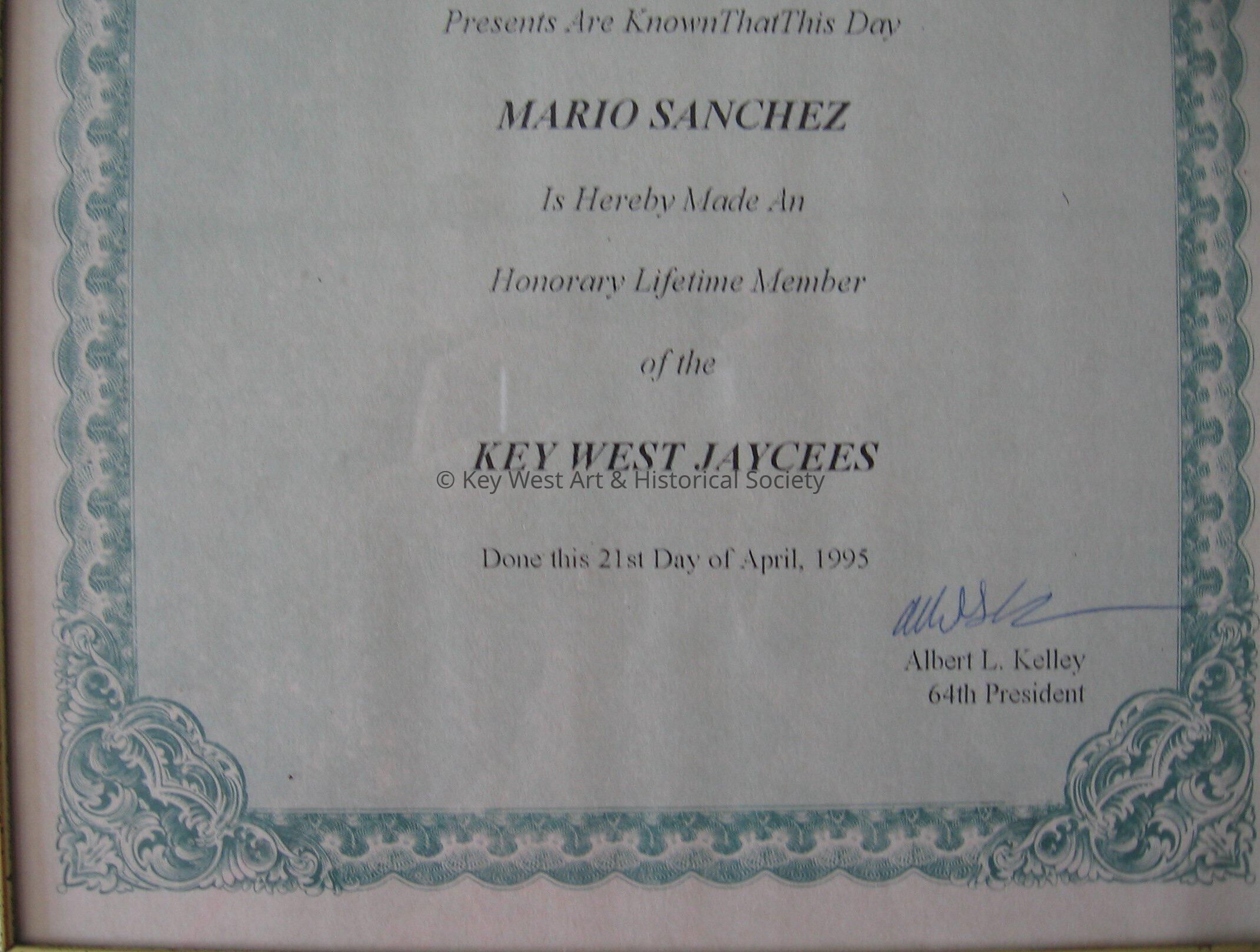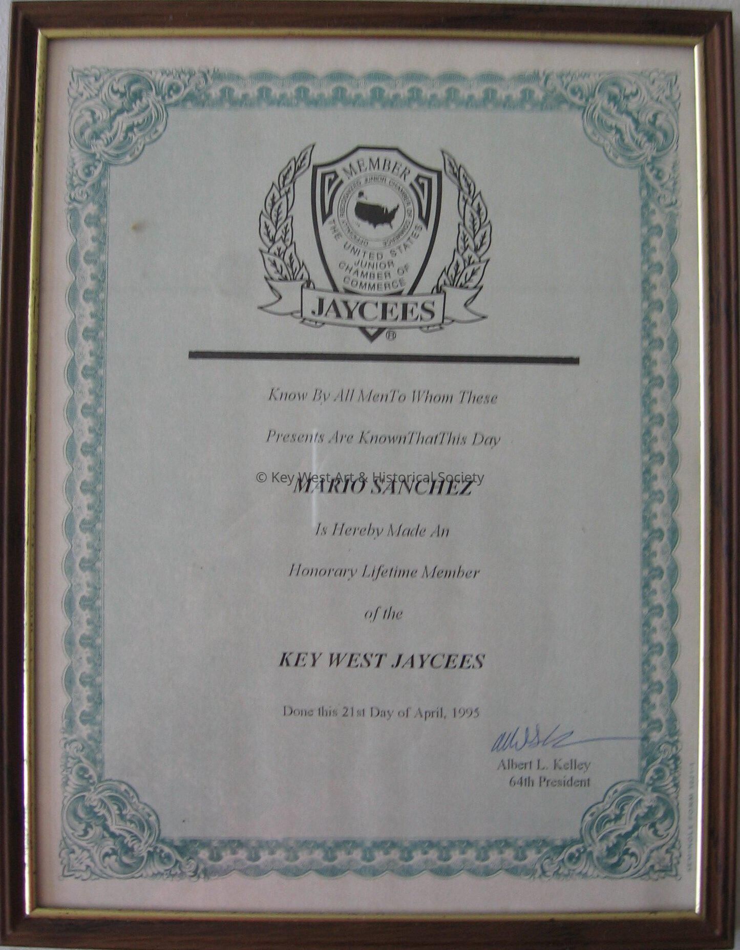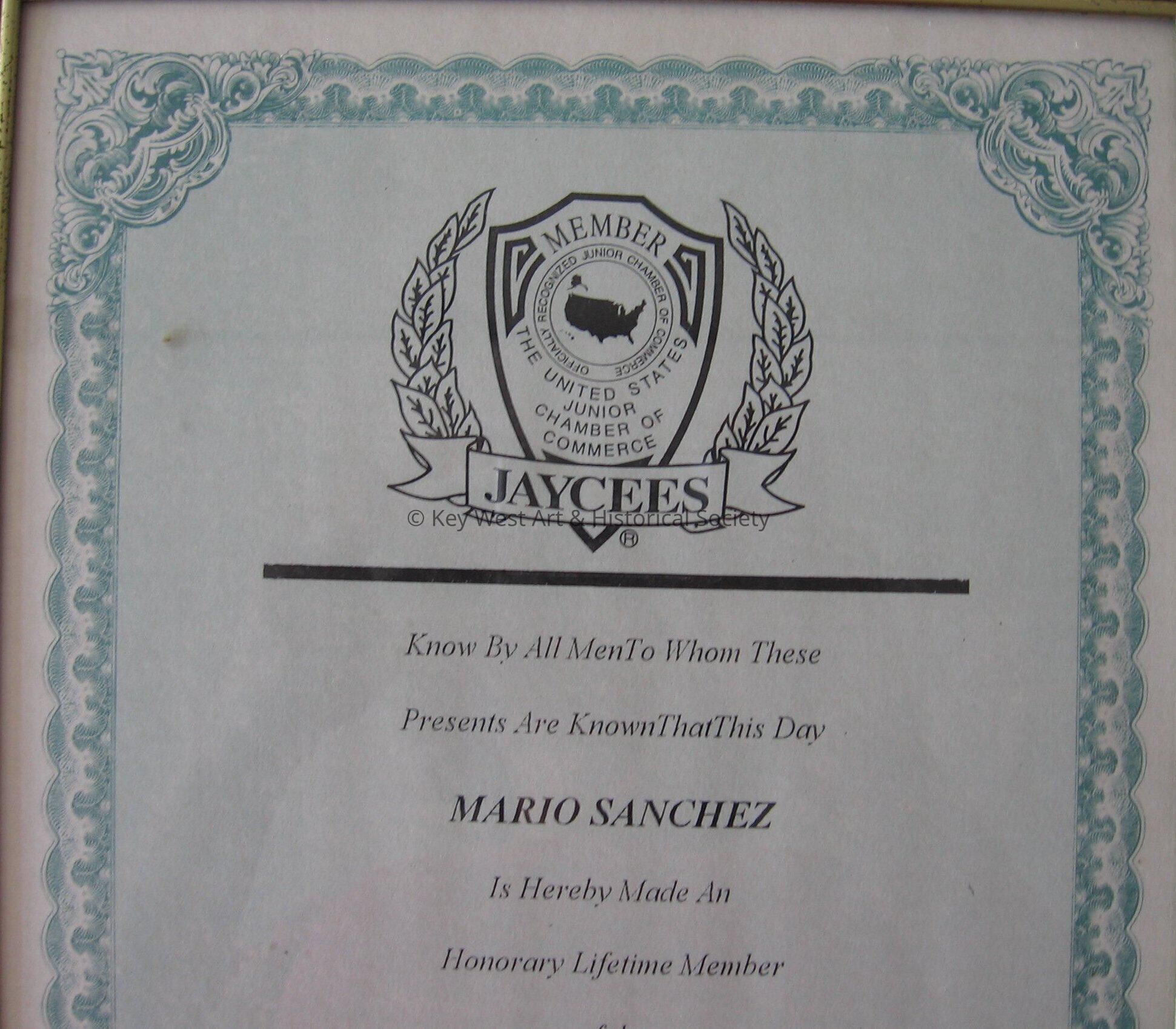 Proclamation by the JAYCEES Junior Chamber of Commerce declaring that Mario Sanchez is an Honorary Lifetime Member. Signed by Albert L. Kelly President. Framed.