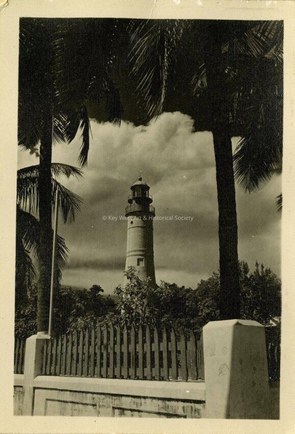 Black and white photograph depicting the Key West Lighthouse taken at the corner of Division Street (Truman Avenue) and Whitehead Street and featuring the concrete and wood fence.Collection