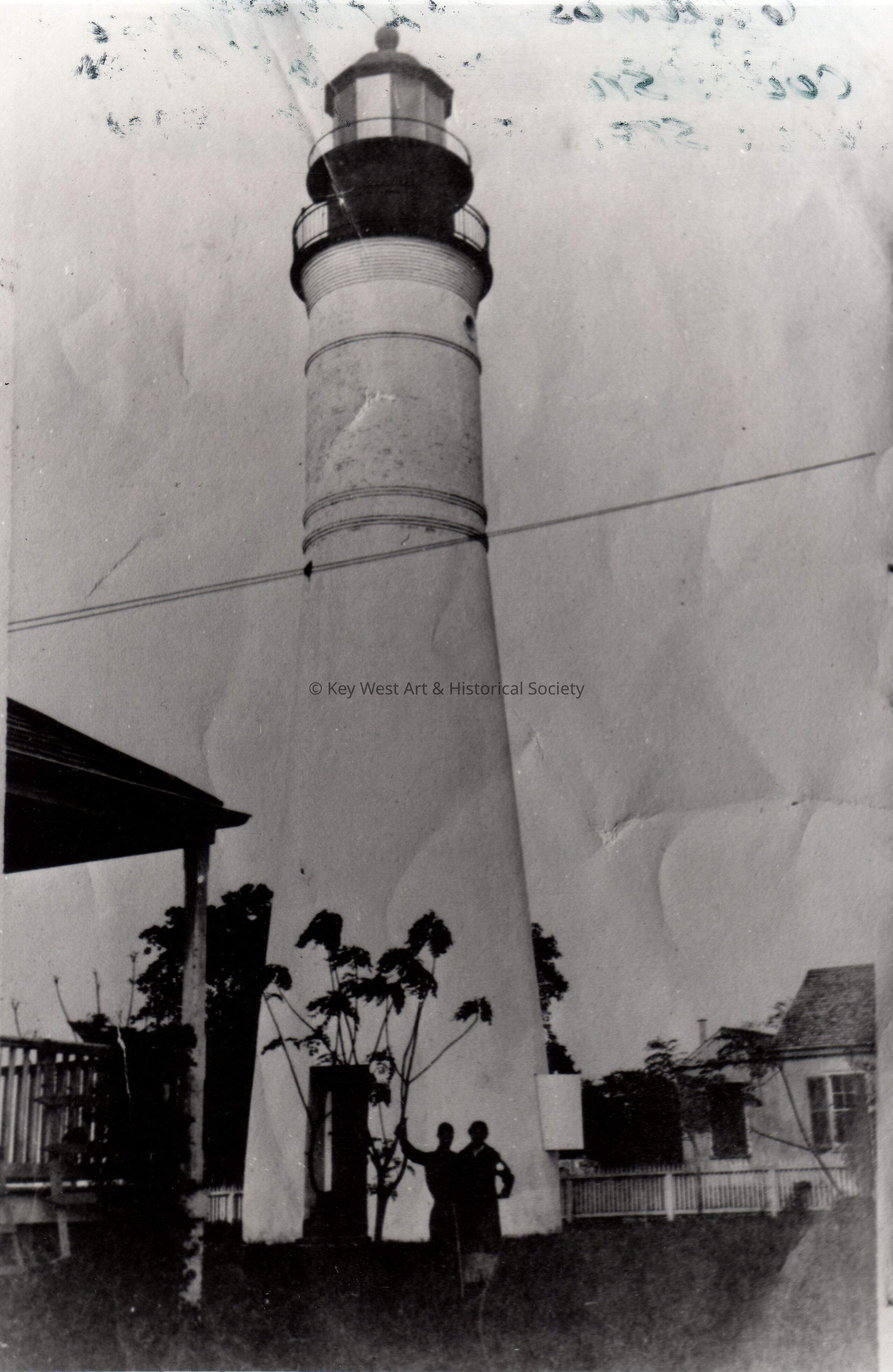 Black and white photograph of people posing in front of Key West Lighthouse.