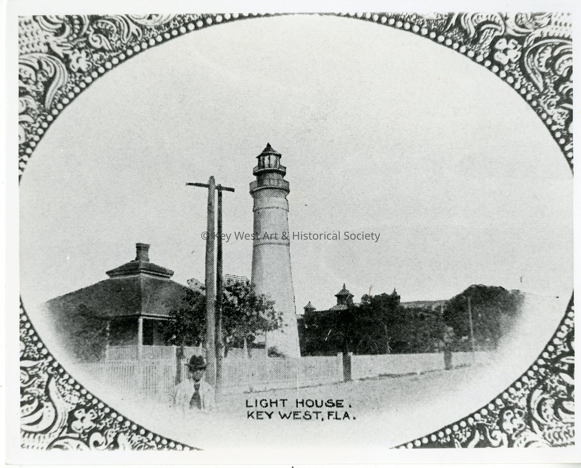 Black and white photograph taken from a postcard of the Key West Lighthouse.