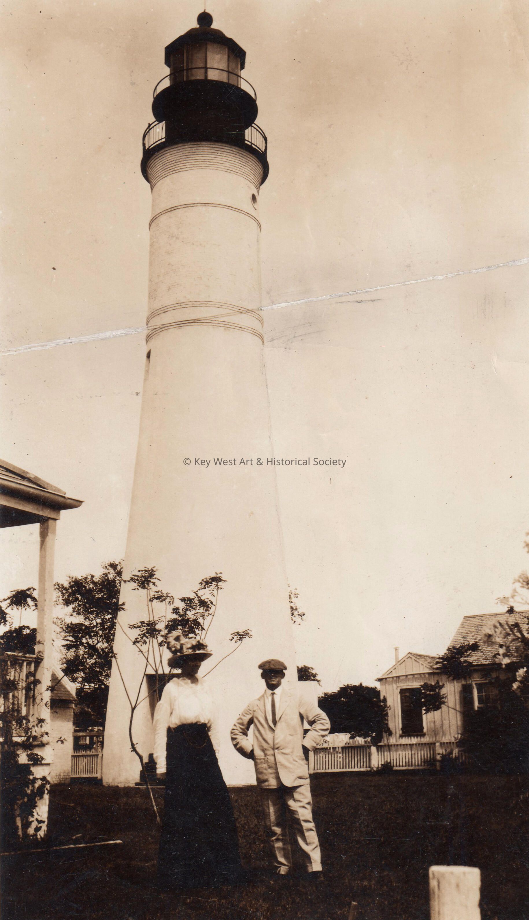 Black and white photograph of two unknown people standing in front of Key West Lighthouse.