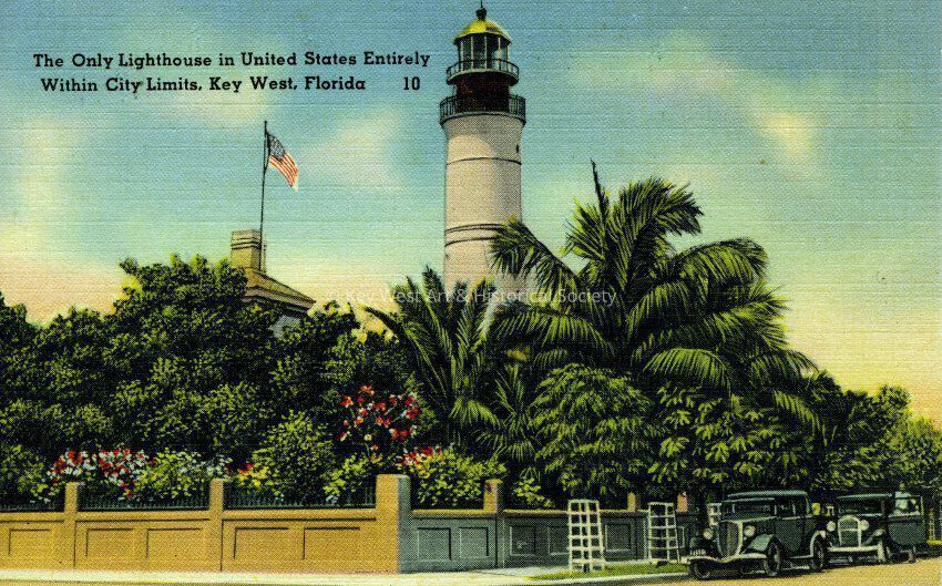 Postcard depicting cars and foliage in front of the Key West Lighthouse. The caption reads, ‘The only lighthouse in United States entirely within city limits, Key West, Florida’. The description on the verso reads, 'The only lighthouse in the U.S. operating within city limits is this one in Key West, which is 130 feet high; a splendid view of the island and surrounding waters is to be had from its top. The grounds, open to the public, contain an aviary, operated by the Superintendent William W. Demerritt, for the purpose of ascertaining the routes of migratory birds by banding and releasing them.'Subject Place