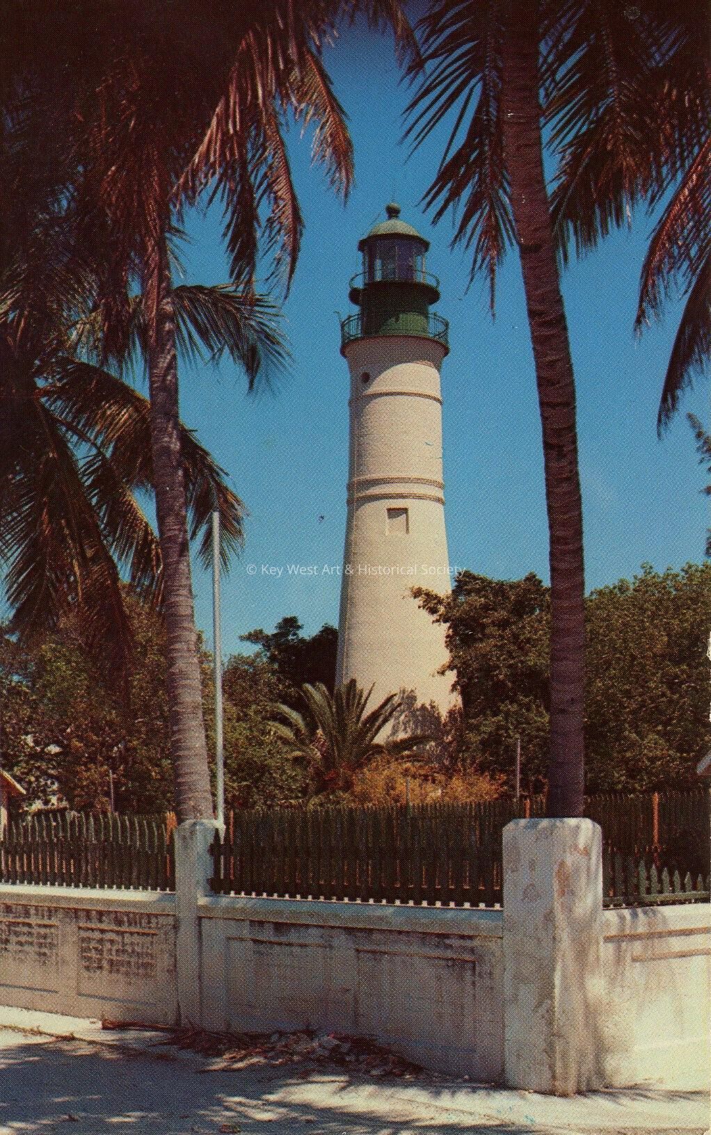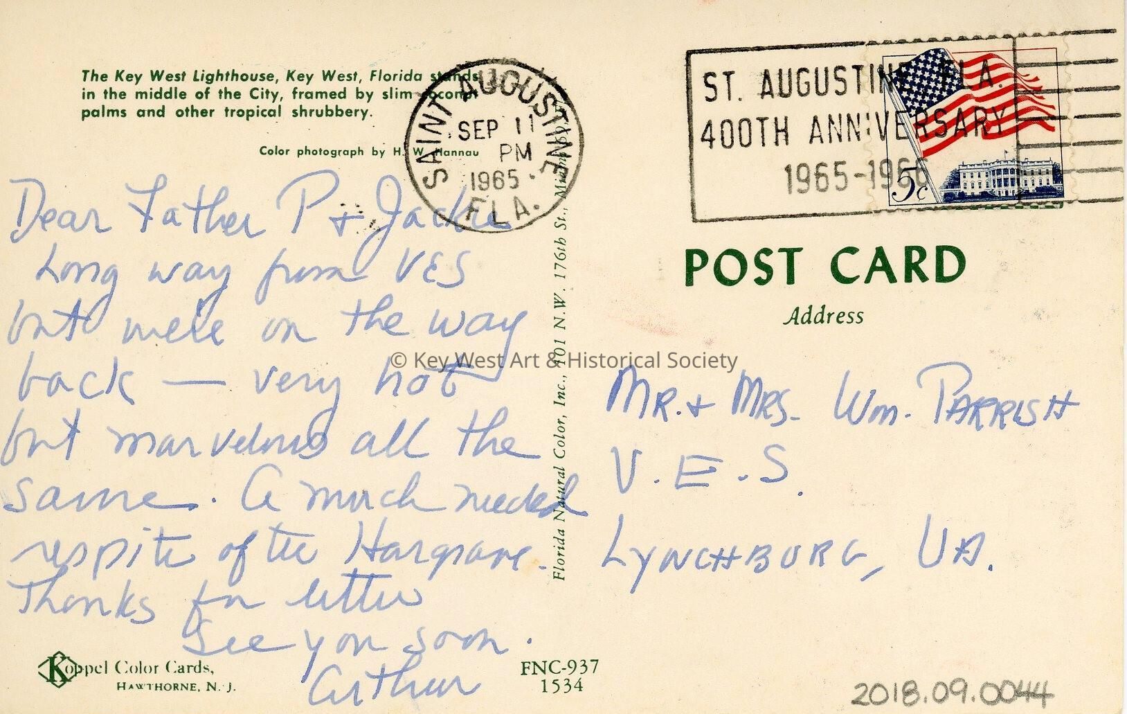 Postcard depicting the Key West Lighthouse. Description on verso reads, 'The Key West Lighthouse, Key West, Florida, stands in the middle of the City, framed by slim coconut palms and other tropical shrubbery.' Message on the verso reads, 'Dear Father P & Jackie, long way from VES but we're on the way back - very hot but marvelous all the same. A much needed respite in the Hargrave. Thanks for letter. See you soon, Arthur.'Subject Place