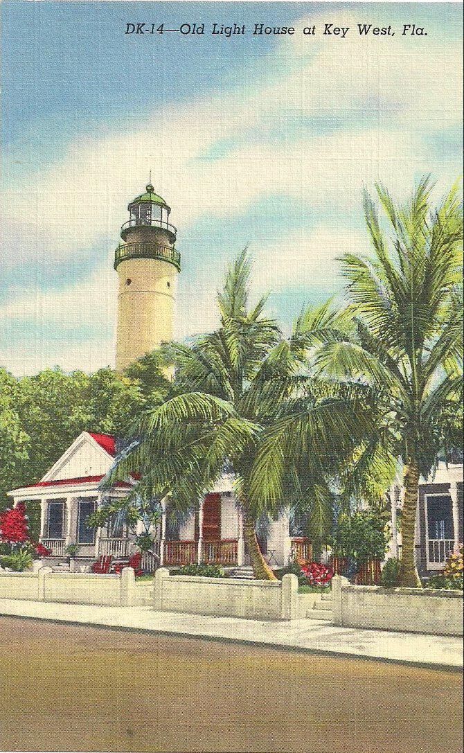 Postcard depicting homes and foliage in front of the Key West Lighthouse. The caption reads, ‘Old Light House at Key West, Florida.' The description on the verso reads, ‘Key West, an exotic coral island, surrounded by the clear blue waters of the Caribbean and the Gulf of Mexico. It is the southern most City in the U.S.’Collection