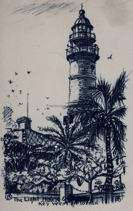 Postcard depicting an F. Townsend Morgan sketch of Key West Lighthouse. The caption reads, ‘The Lighthouse, Key West, Florida’.Collection
