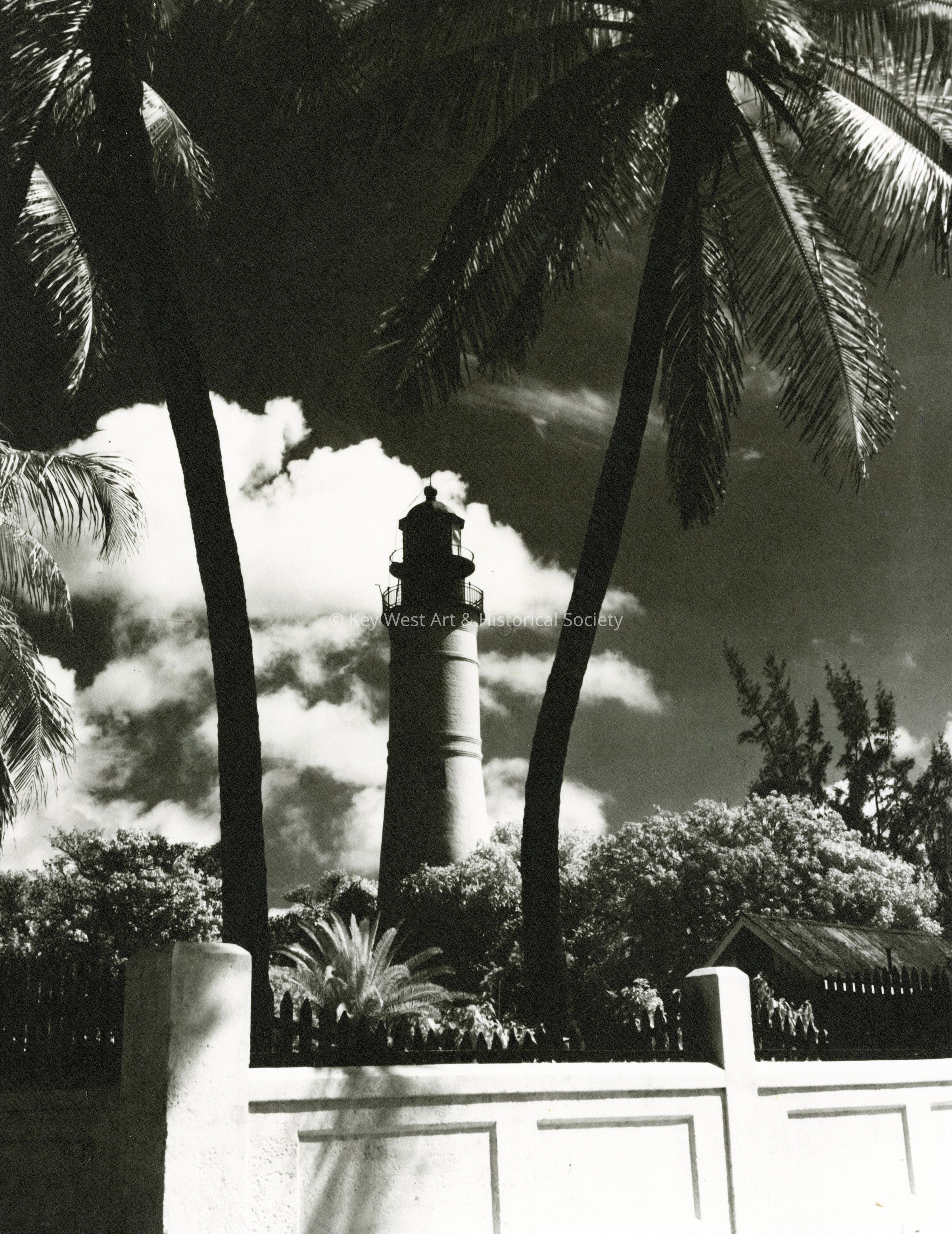 Black and white photograph of the Key West Lighthouse taken from outside the fence.