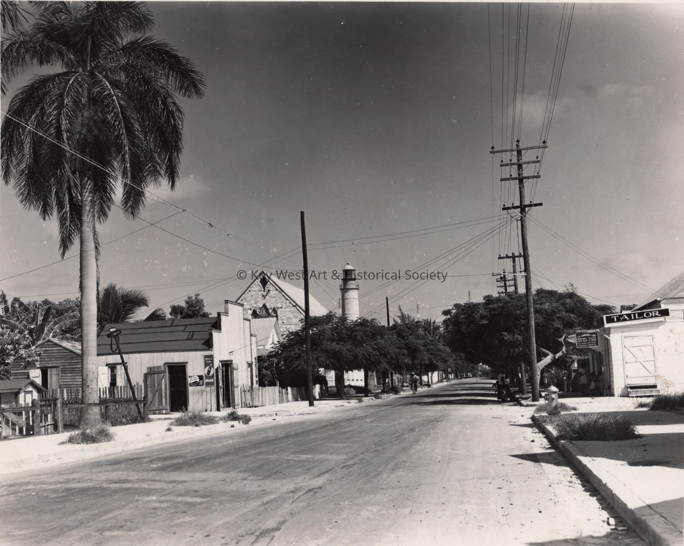 Black and white photograph of the Whitehead Street view of Key West Lighthouse