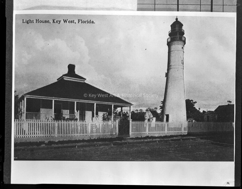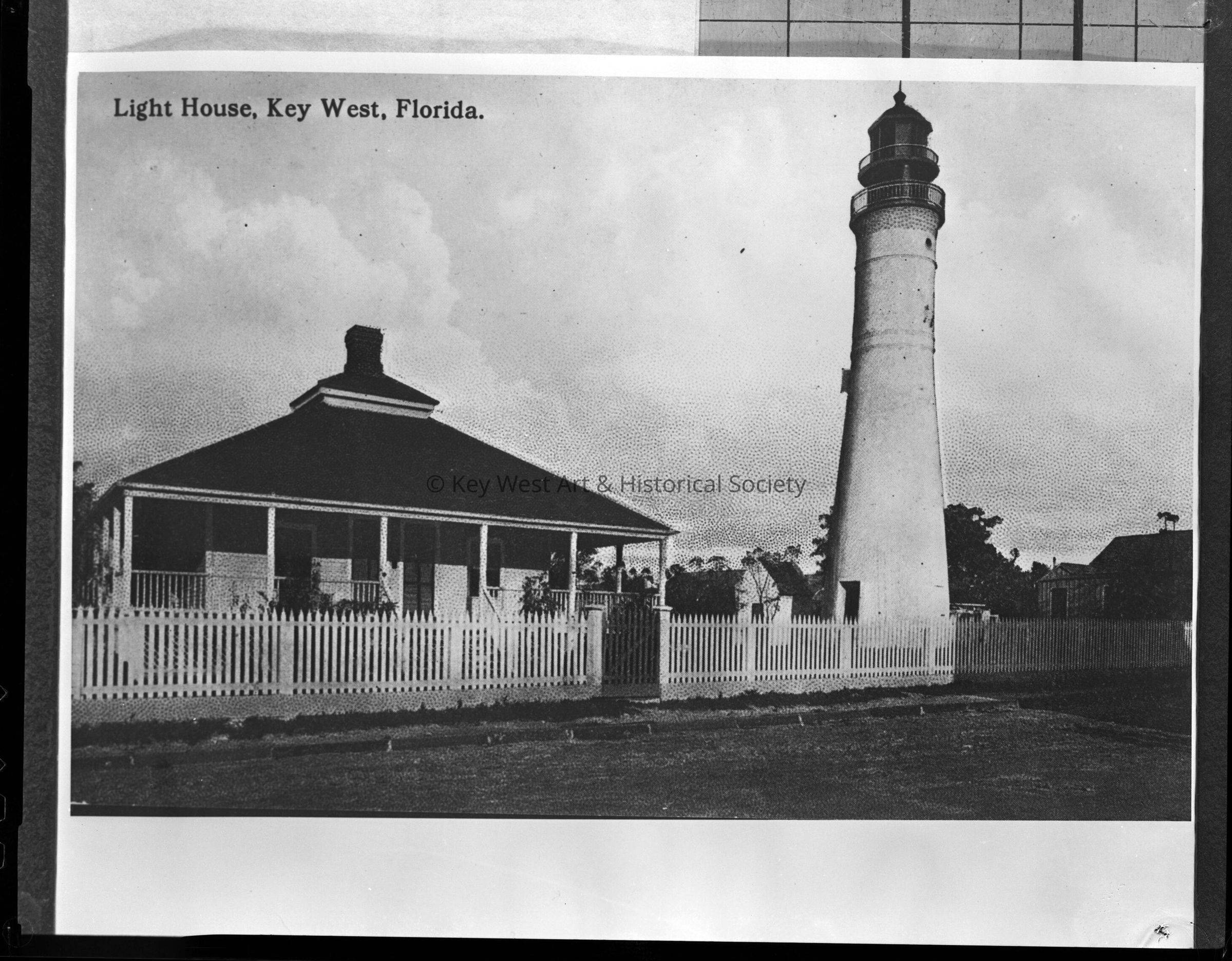 Black and white negative of the Key West Lighthouse and Keeper's Quarters taken from Whitehead Street.