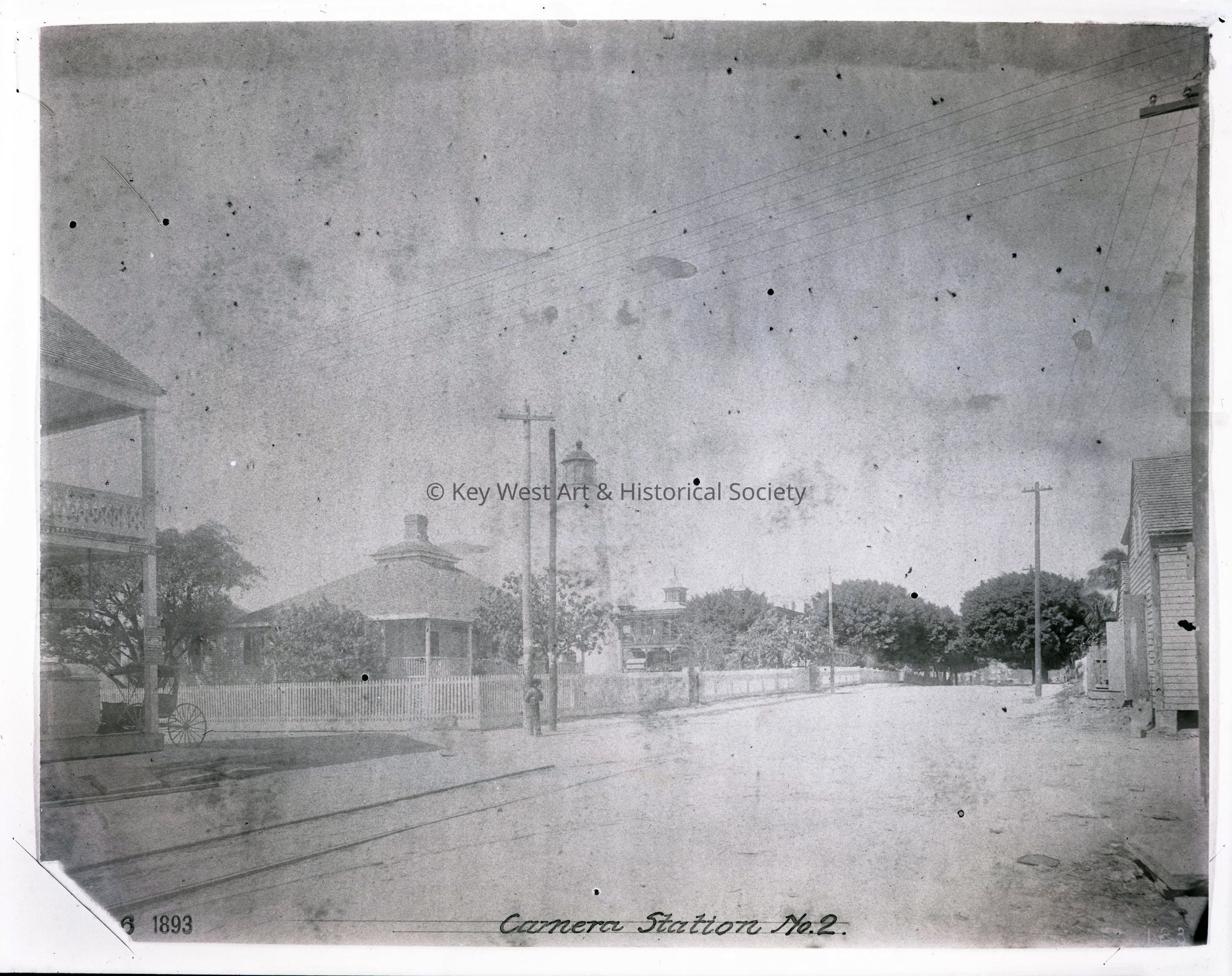 Black and white negative of the Key West Lighthouse and Keeper's Quarters taken from Camera Station No. 2.