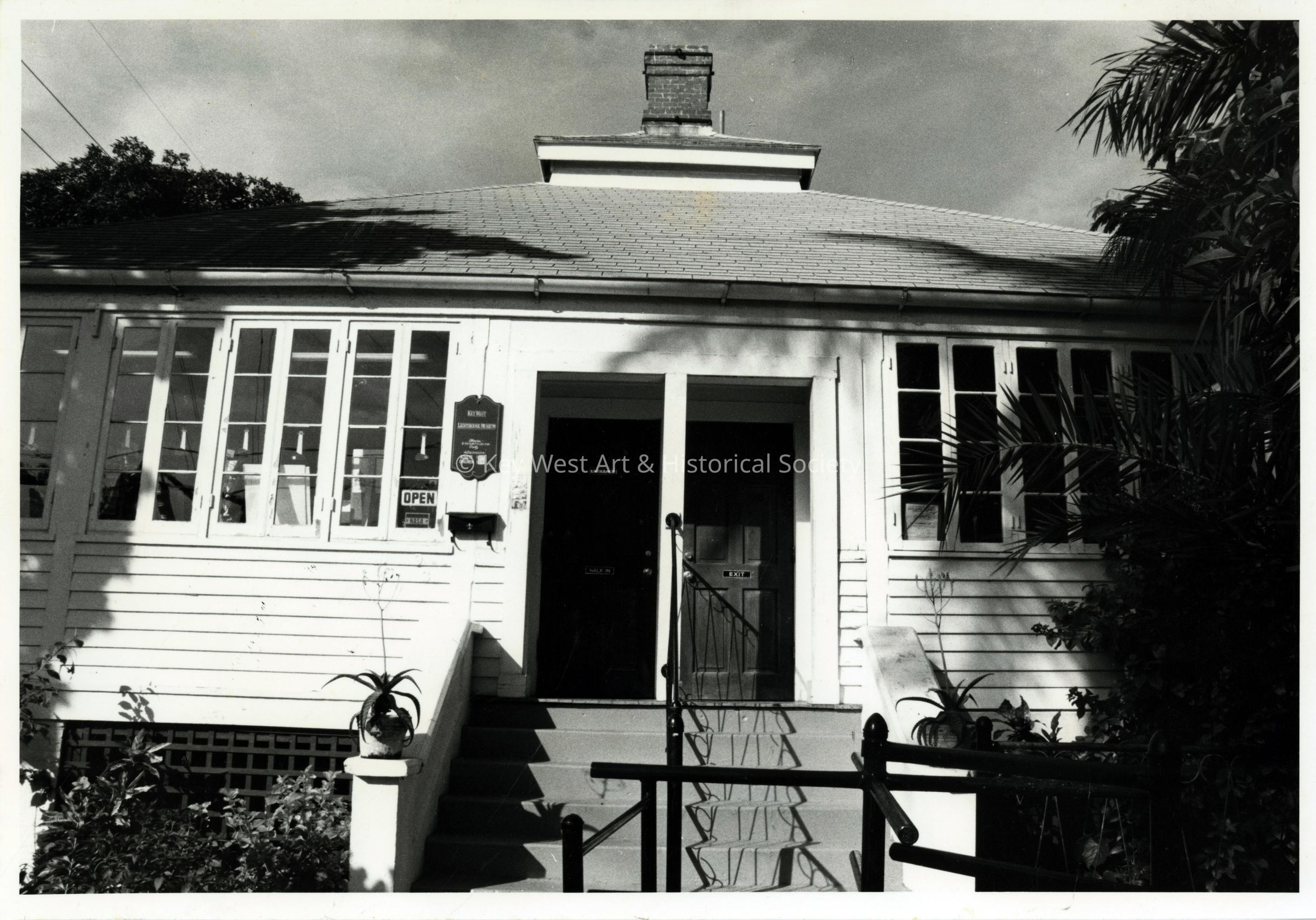 Black and white photograph depicting the front entrance of the Key West Lighthouse Keeper's Quarters when it was operated as a military museum. Note the front porch of the quarters was enclosed.