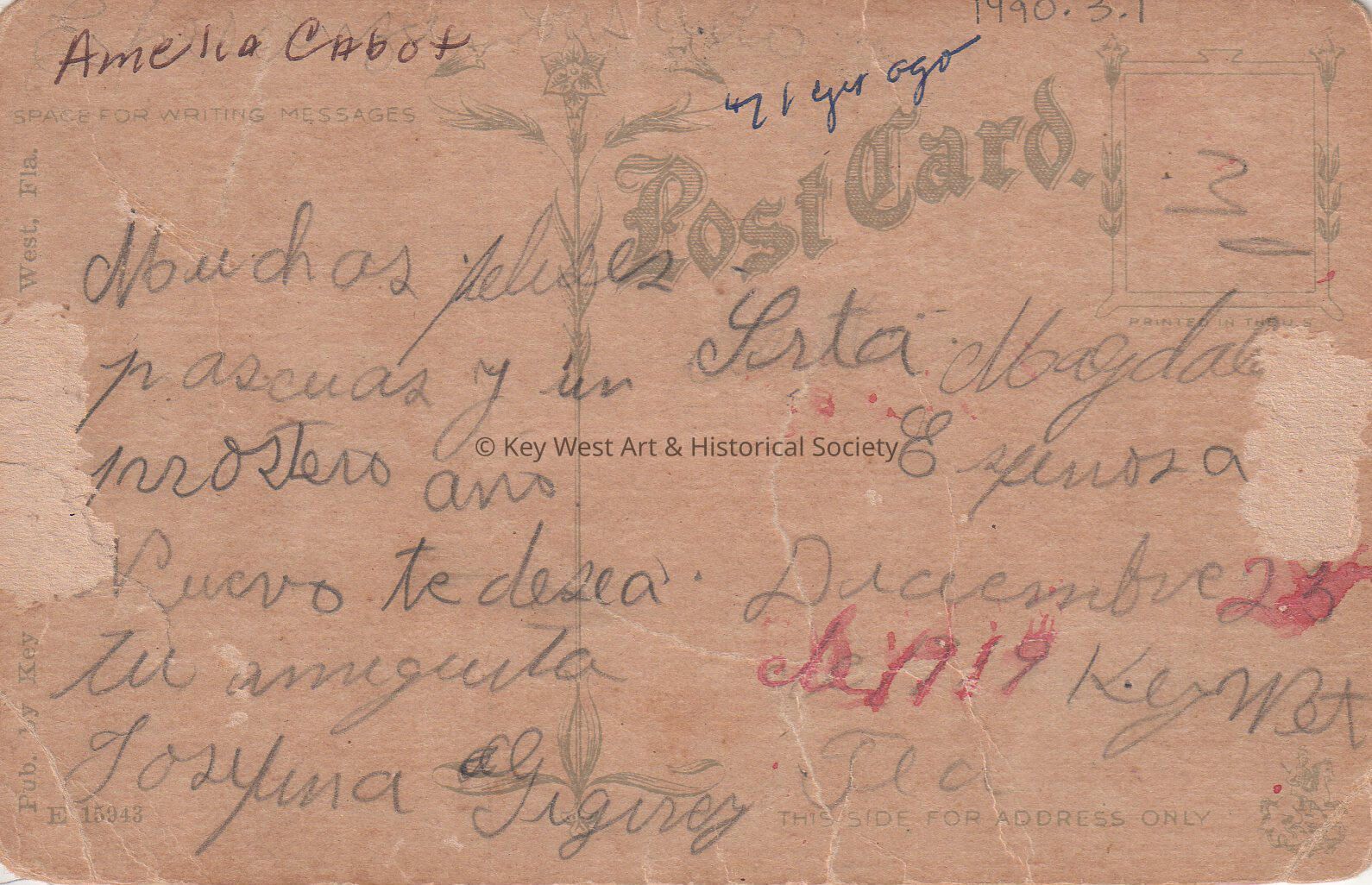 Postcard depicting a lighthouse and Keeper’s Quarters. The caption reads, ‘Key West Lighthouse, Key West, Florida’. The message on the verso reads, ‘Amelia Cabot, Muchas felises ___. Josefina Tigerez.' The card is addressed to Srta. Magdel__, December 25, 1919, Key West, Florida.Subject Place