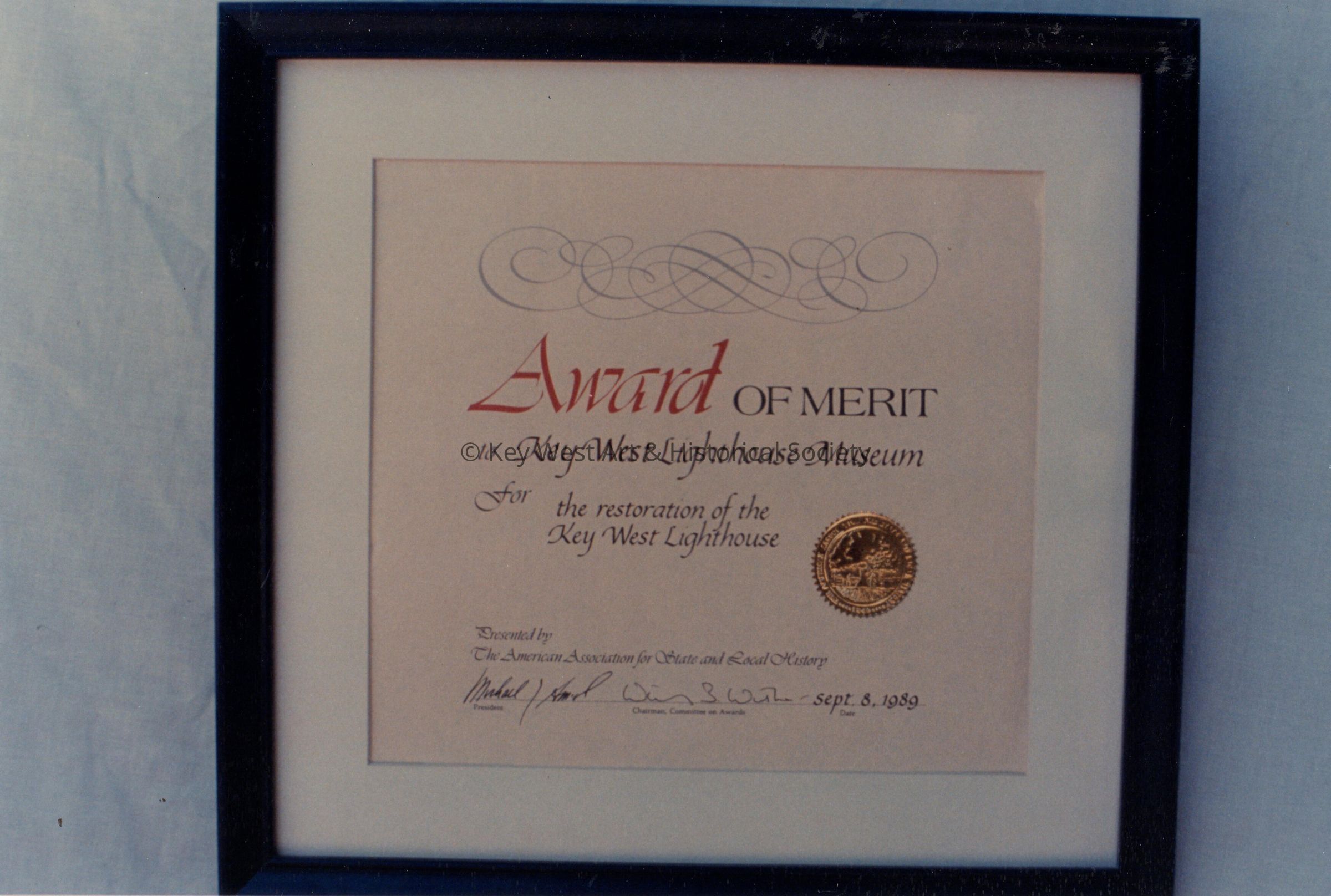 Key West Lighthouse Museum Award of Merit, dated September 8, 1989.Collection