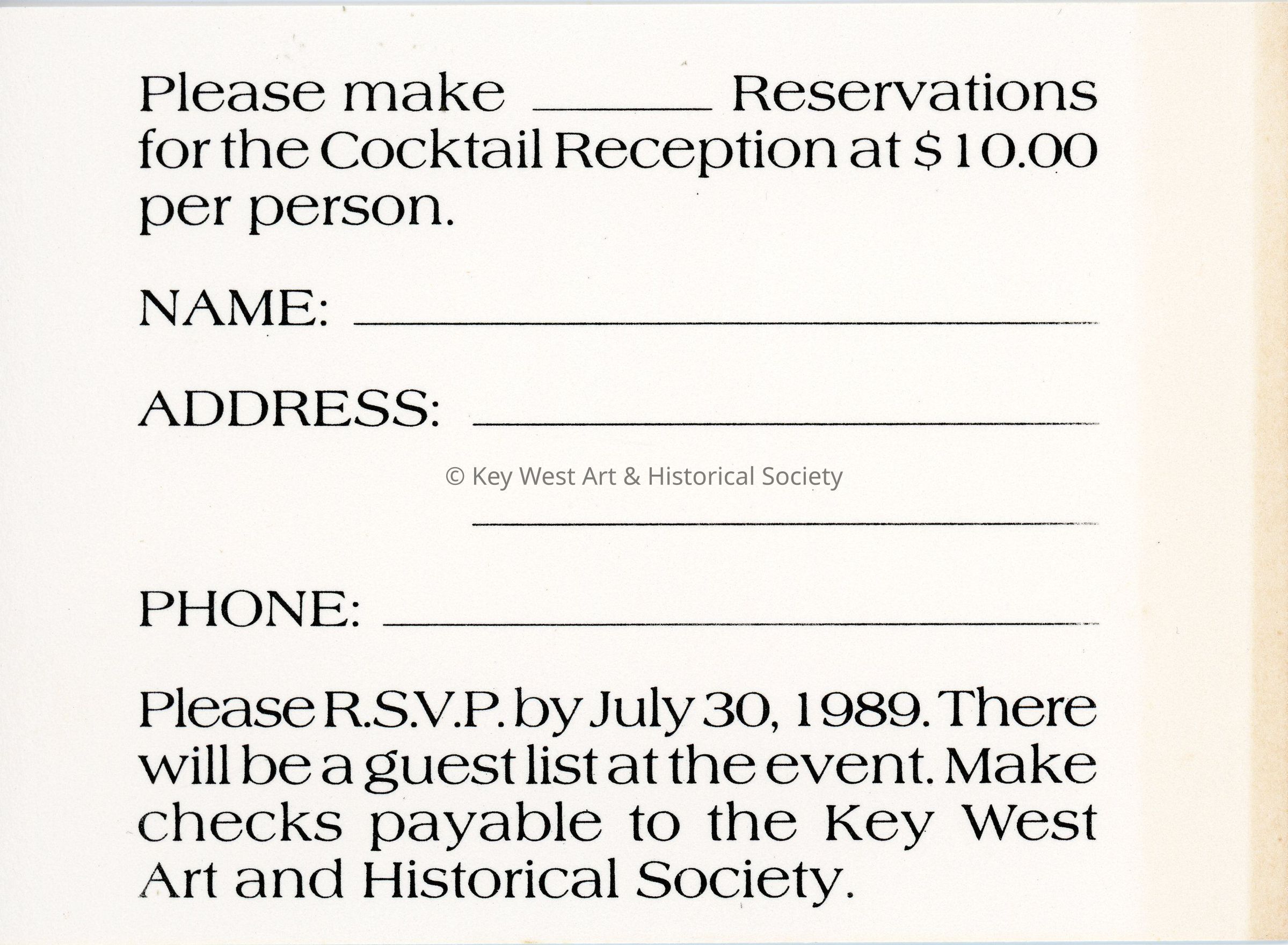 An RSVP card for the Key West Lighthouse Restoration Cocktail Reception to celebrate the United States Coast Guard Group Key West and the Bicentennial of the American Lighthouse Service. The event was held on August 5, 1989 at the Key West Lighthouse Museum at 938 Whitehead Street.Collection