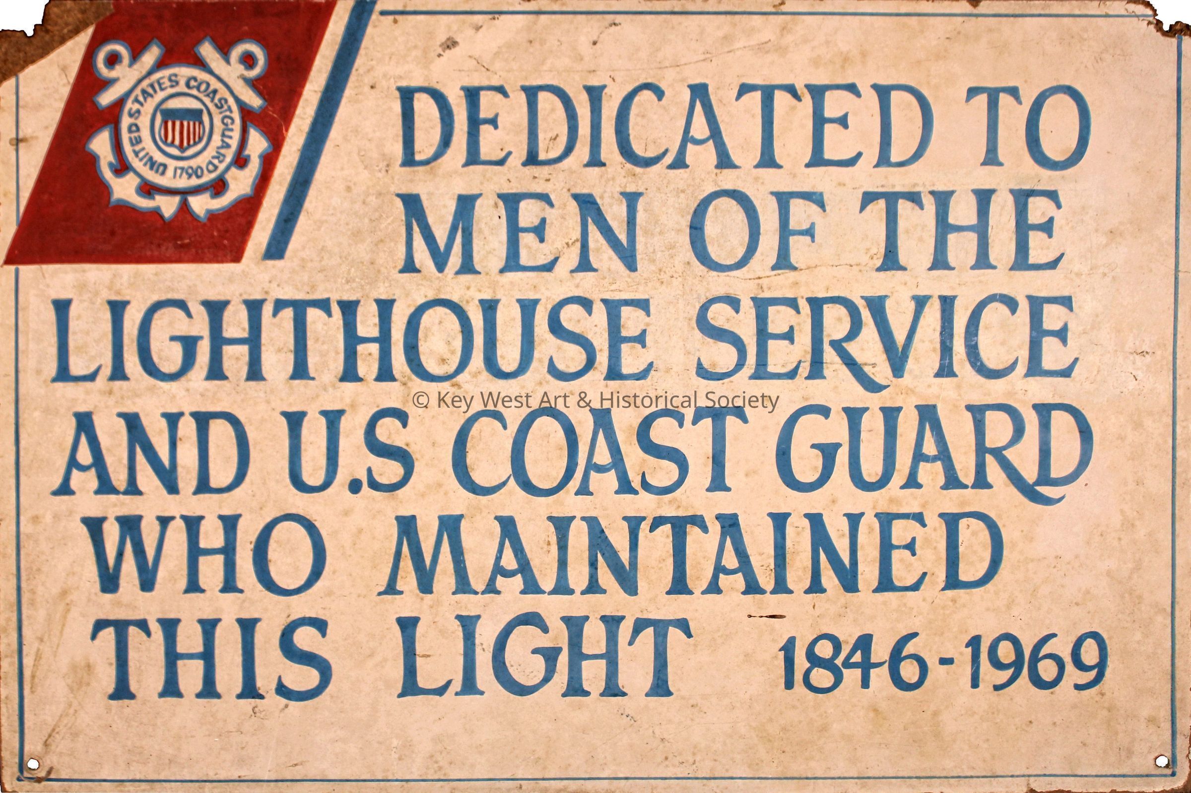 Wooden painted sign reading 'Dedicated to Men of the Lighthouse Service and U.S. Coast Guard Who Maintained this Light 1846-1969' that once hung at the Key West Lighthouse when it was a military museum. The USCG insignia decorated the upper left corner.Collection