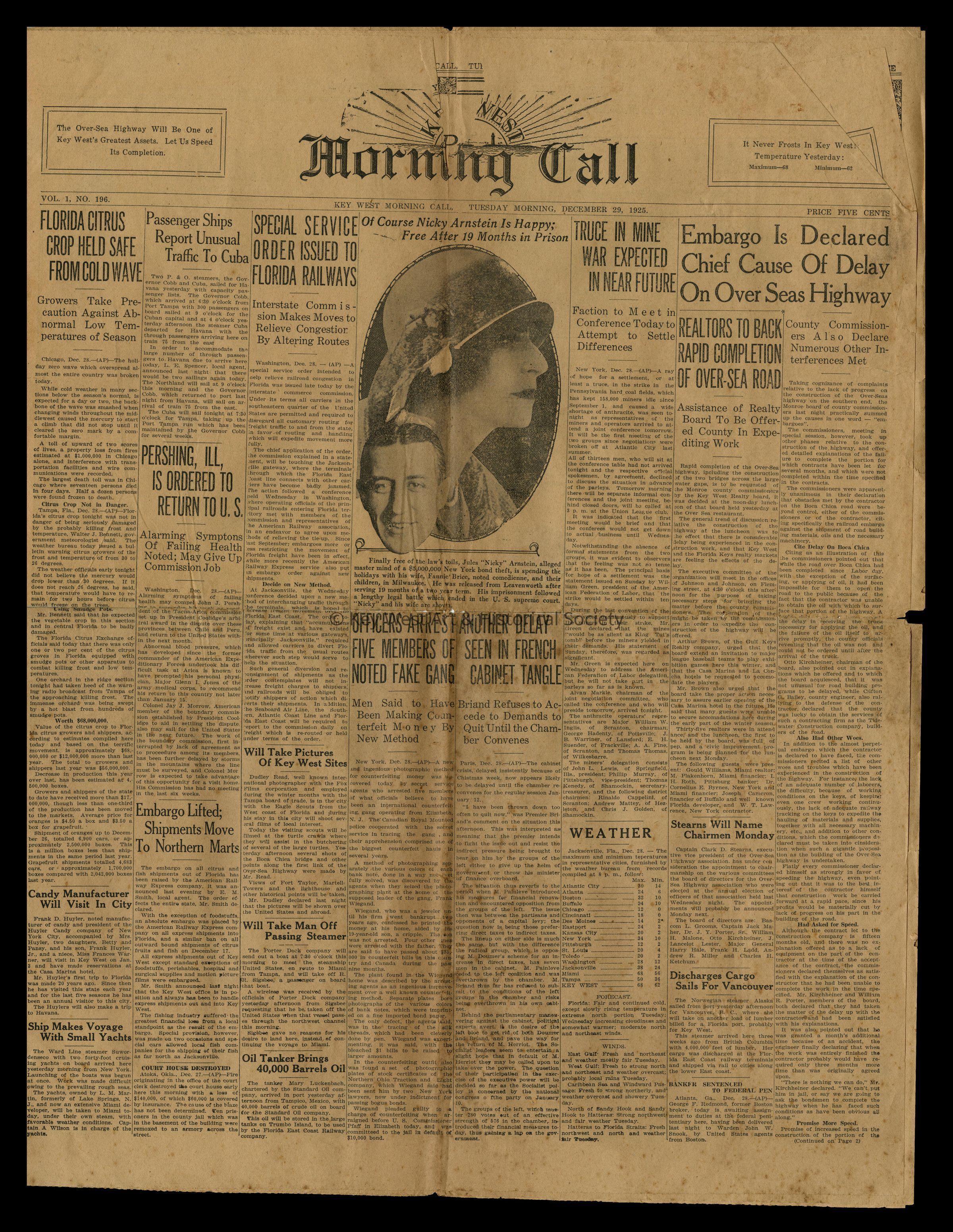 Edition of the 'Key West Morning Call' newspaper published on December 29, 1925. Of particular interest is an article about the Overseas Highway.