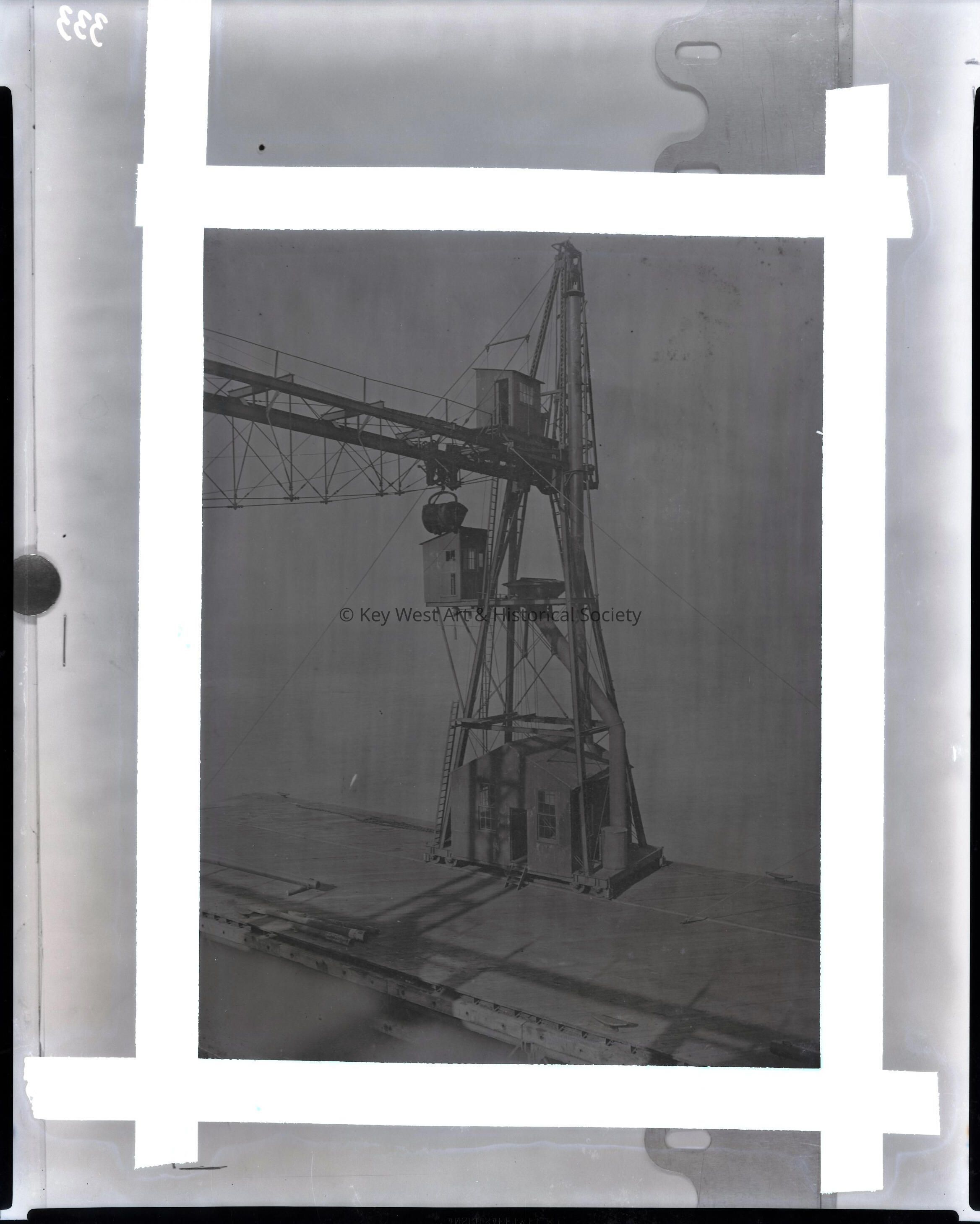 Black and white negative of the coaling fueling rig at Naval Station Key West.
