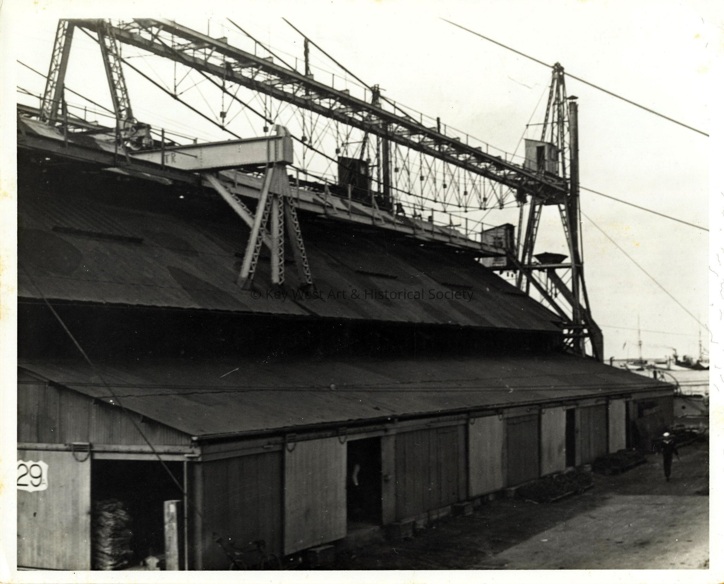 Black and white photograph of the coaling rig and coaling warehouse at Naval Station Key West.