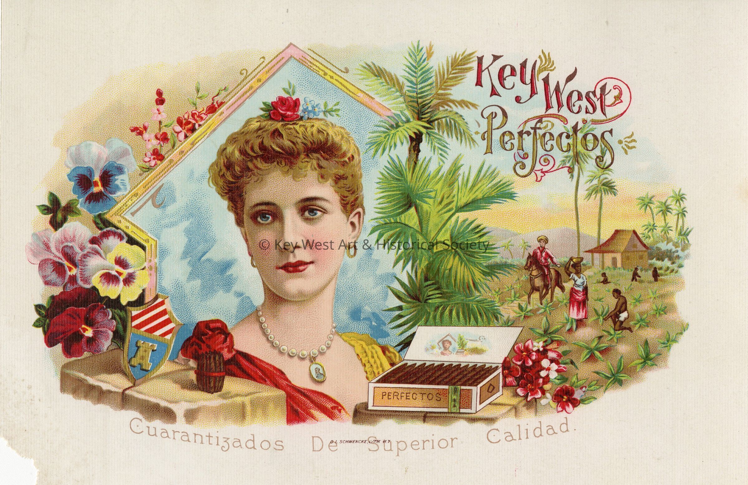 Full color lithograph inner box cigar label promoting Key West Perfectos. Likely taken from a sample book produced by the lithographer. Caption on bottom edge reads, 'Cuarantizados De Superior Calidad'.Type of Print