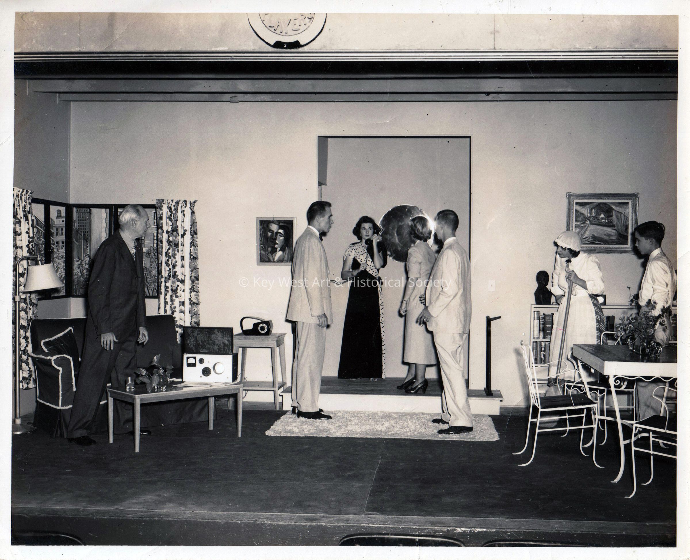 Black and white photograph of actors from the Key West Players on stage at the Waterfront Playhouse during a production of 'One is a Crowd'.