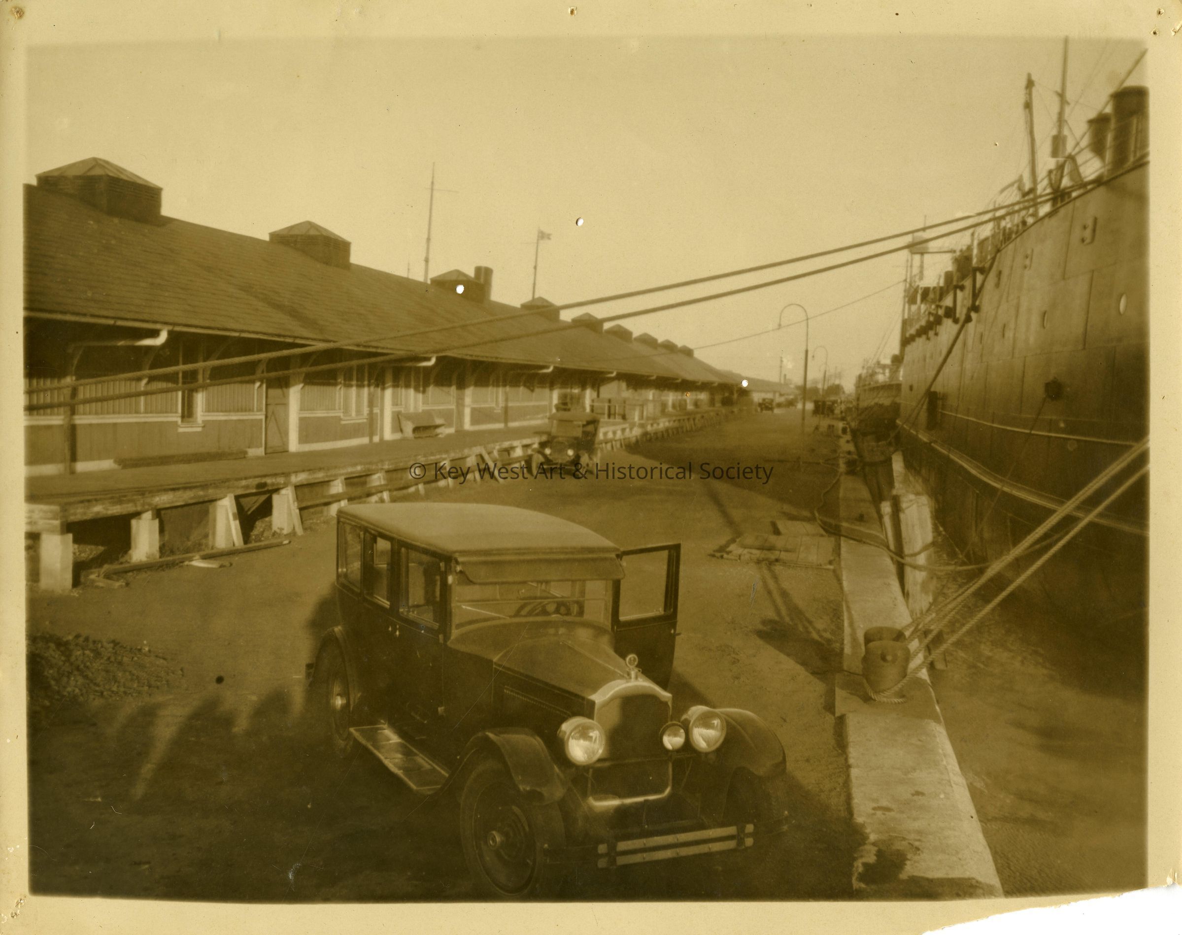 Black and white photograph of a car parked alongside the steamship and the Florida East Coast Railway's freight depot in Key West.