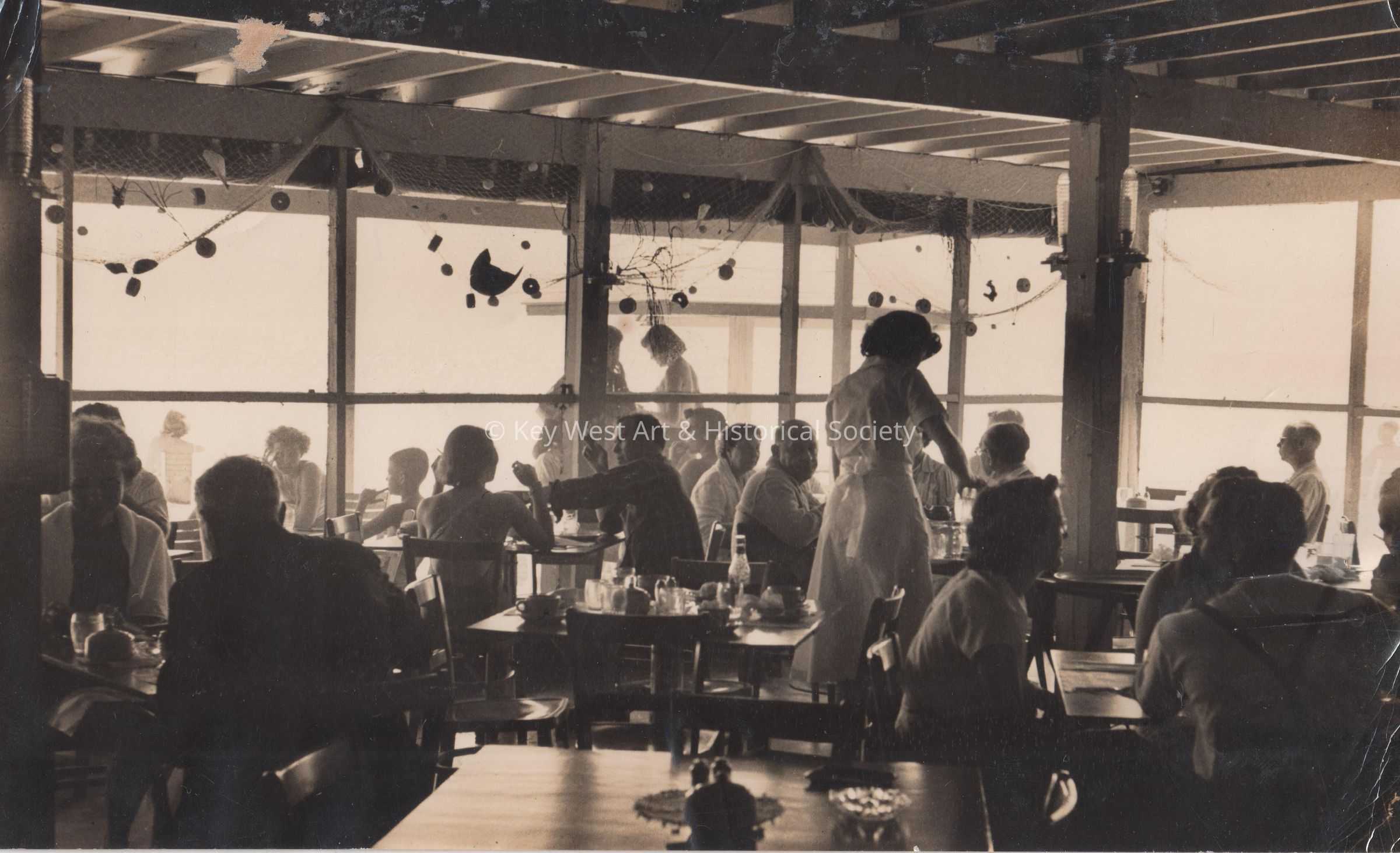 Black and white photograph of the interior of an unknown Key West restaurant, possibly A&B Lobster House.