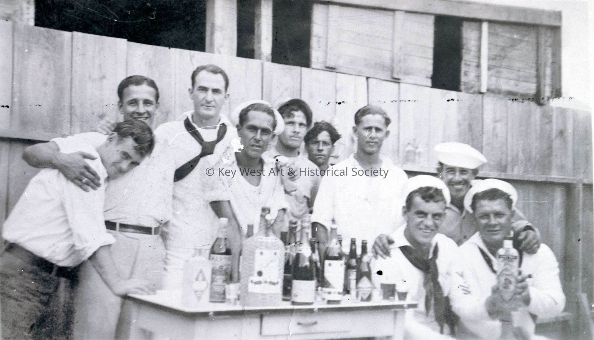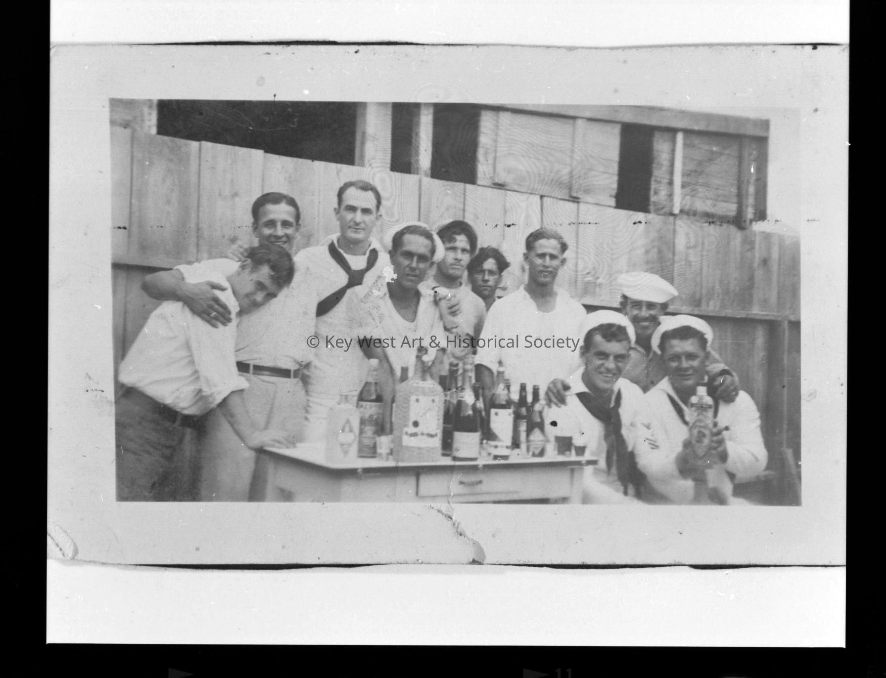 Black and white negative of intoxicated Key West rum runners alongside U.S. Navy personnel.