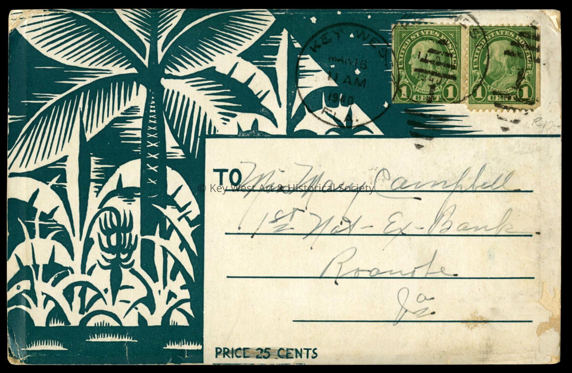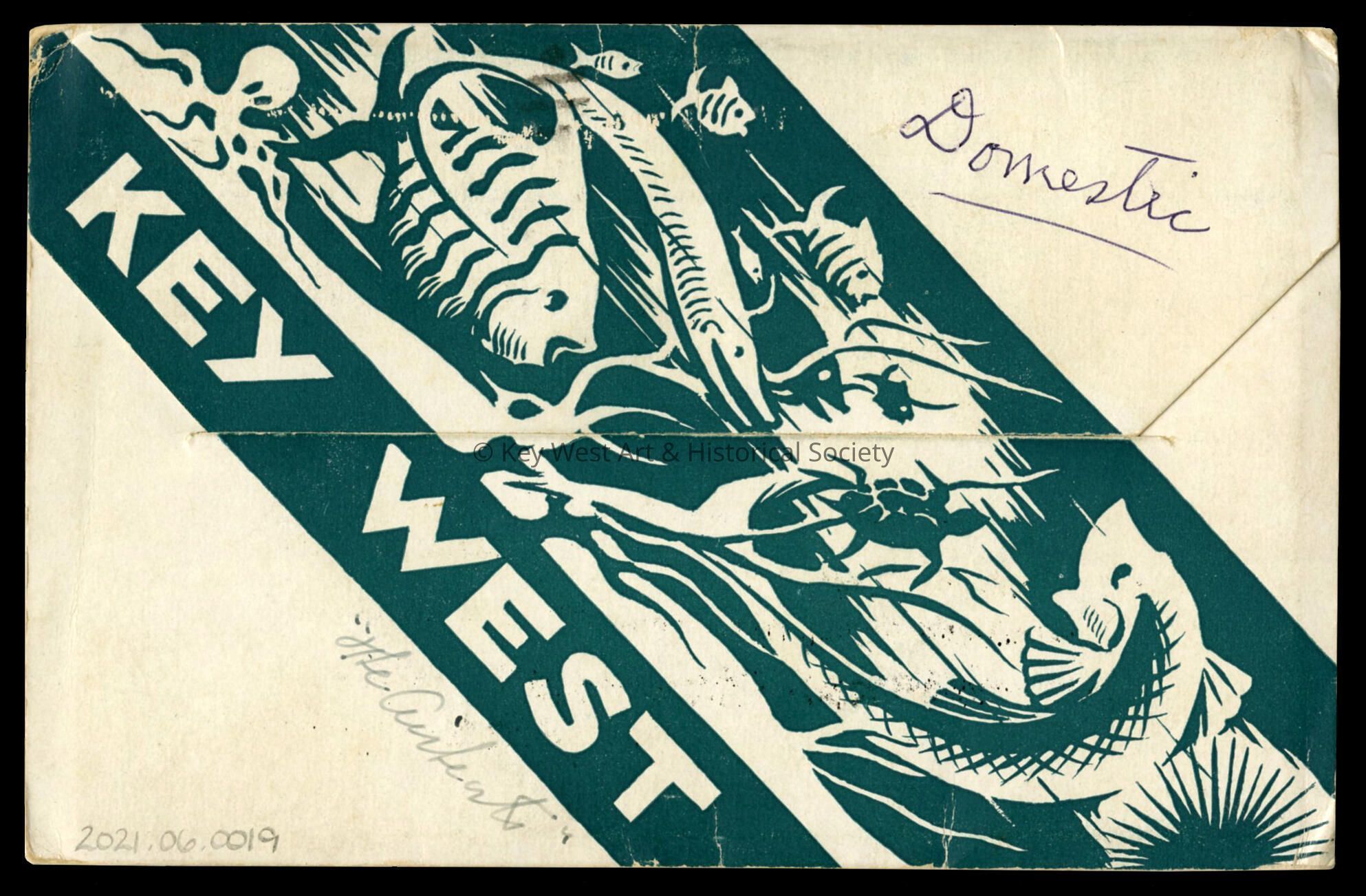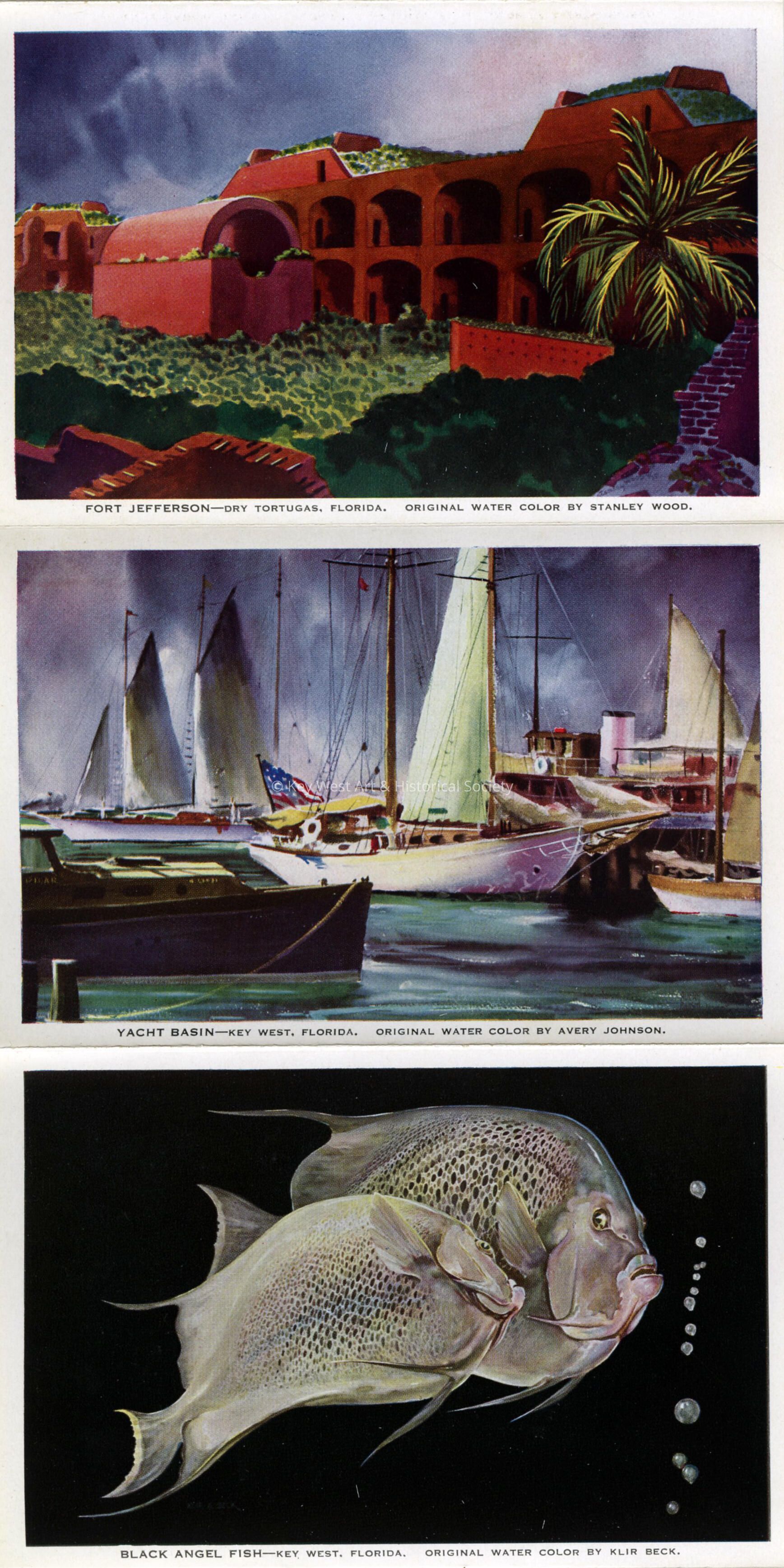 Souvenir folder of cards depicting scenes in Key West and the Dry Tortugas. There are 12 single-sided images folded accordion-style. The postcards are taken from paintings created by WPA artists including Edward Bruce, Avery Johnson, Richard Jansen, Stanley Wood, Klir Beck and Richard Sargent. The original cost was 25¢.