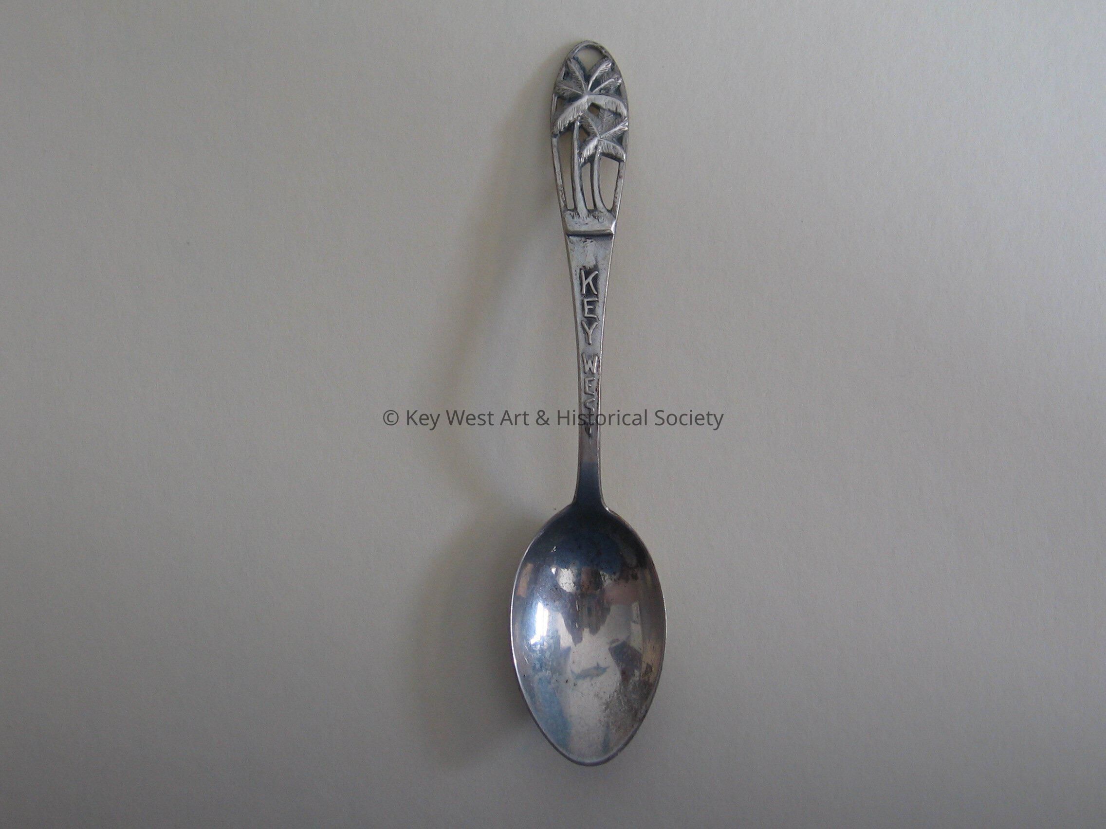 Sterling silver spoon with palm trees on the tip of the handle and Key West written down the handle.