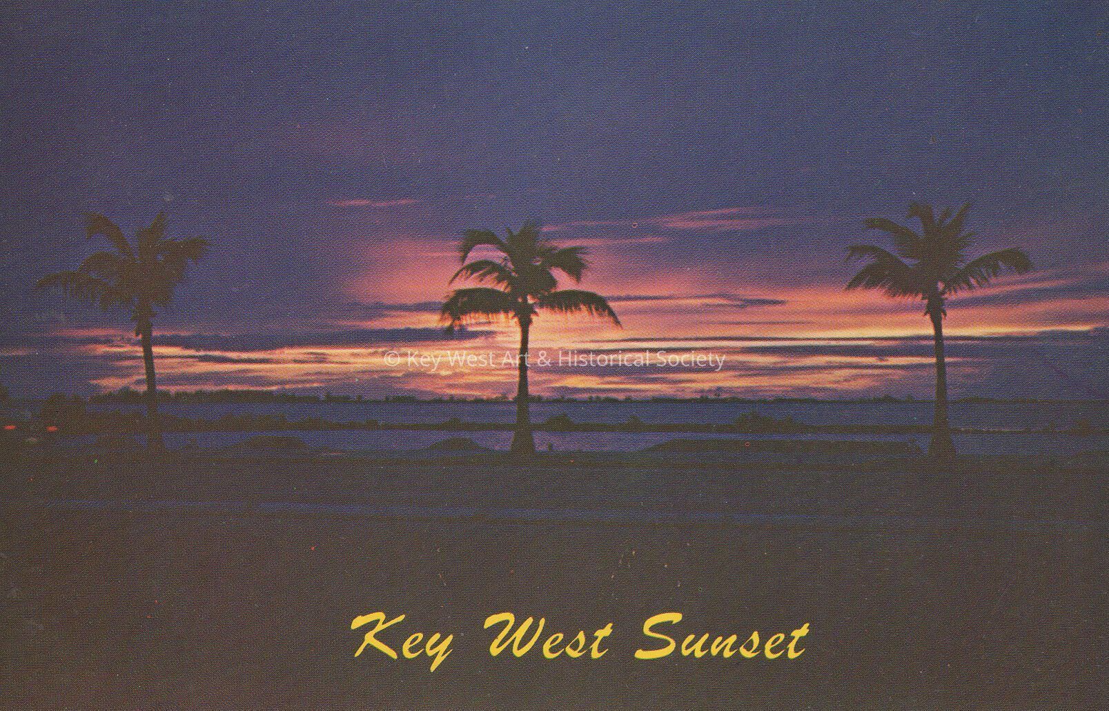 Postcard depicting a sunset over the water as seen through palm trees. The caption reads, ‘Key West Sunset’. The description on the verso reads, 'Key West Sunset, Roosevelt Boulevard - Fleming Key in background.'Subject Place