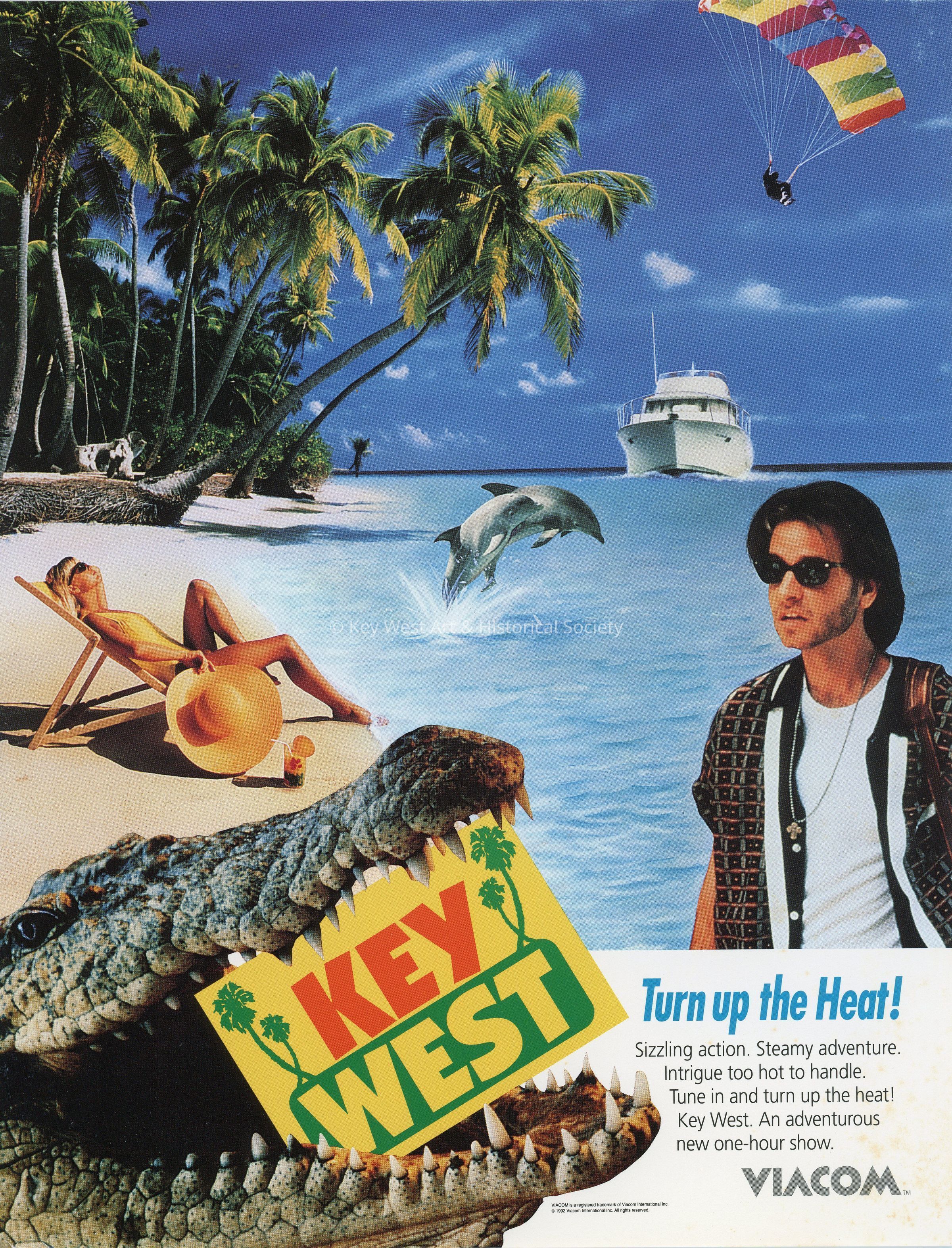 Small promotional poster for the television show 'Key West.' The poster shows a woman sunbathing on a beach with dolphins leaping out of the water with a yacht and parasailer in the background. In the foreground is actor Fisher Stevens and what appears to be an American crocodile.Collection