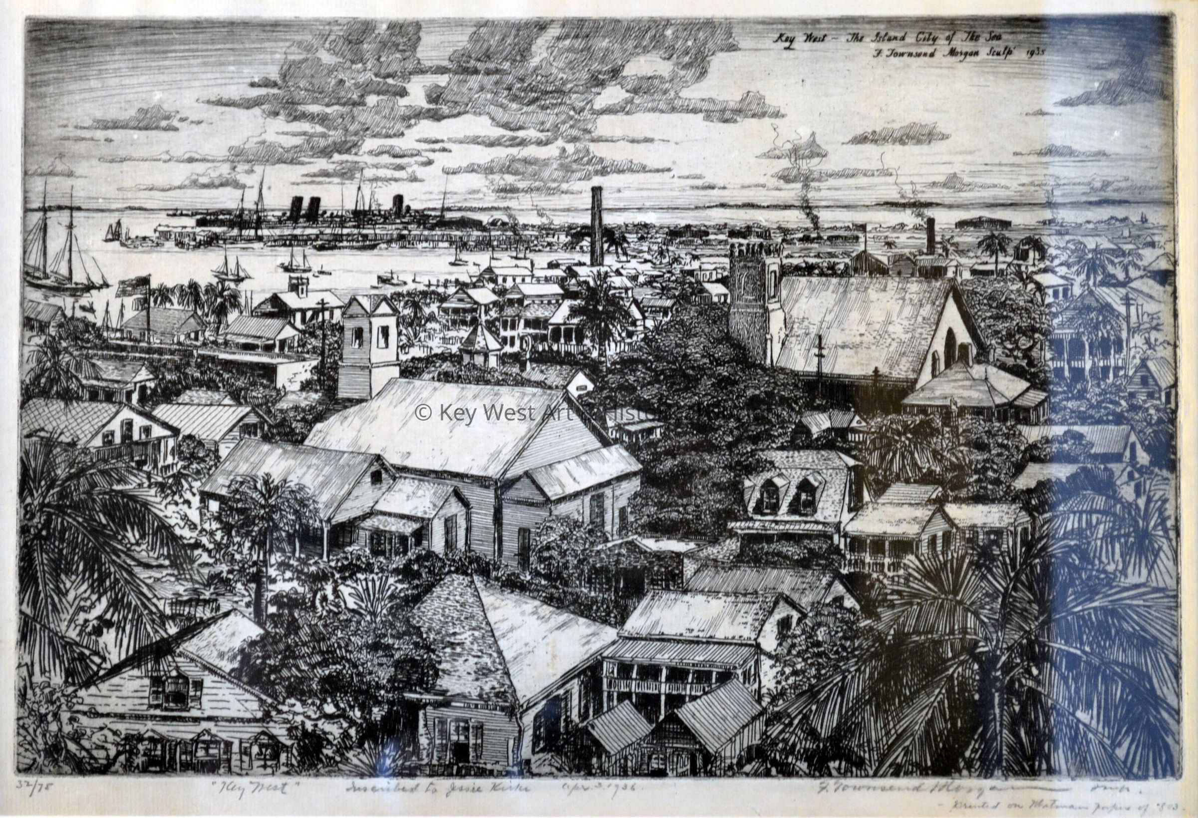 Etching by F. Townsend Morgan of the Key West roof-line looking toward the Key West Bight.