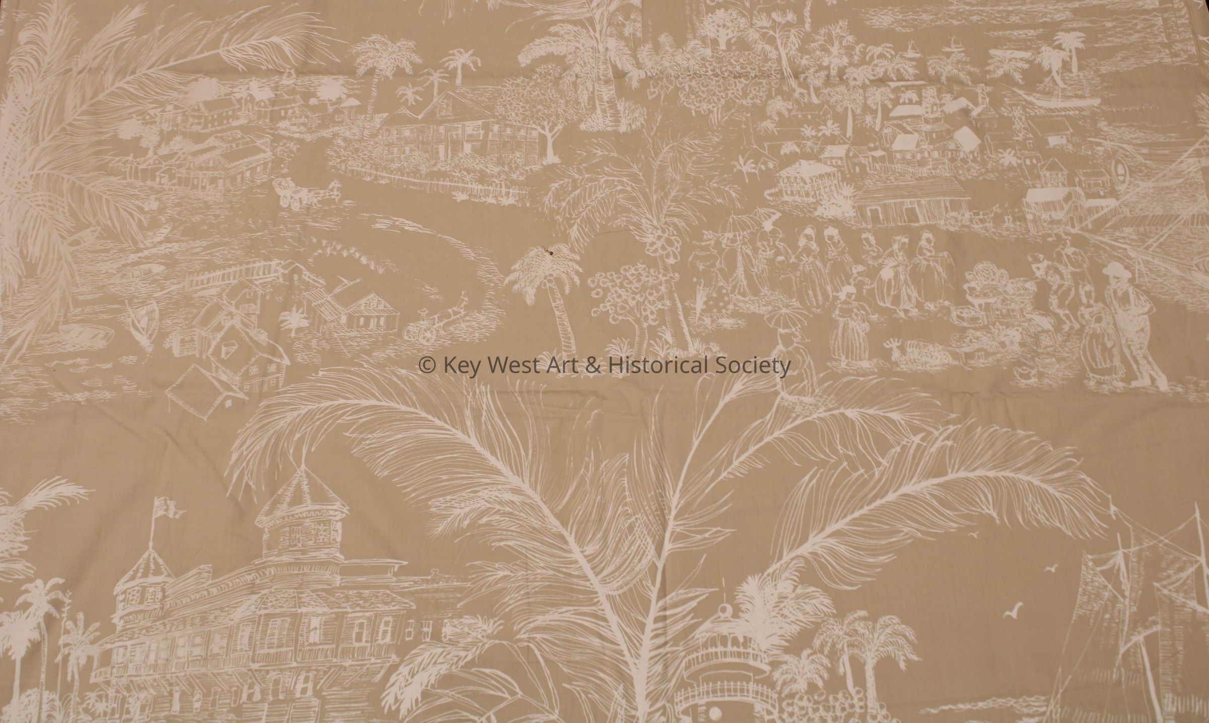 Tan and white cotton canvas Key West toile made by Key West Hand Print Fabrics. The print includes prominent buildings, ships, and the lighthouse.Collection