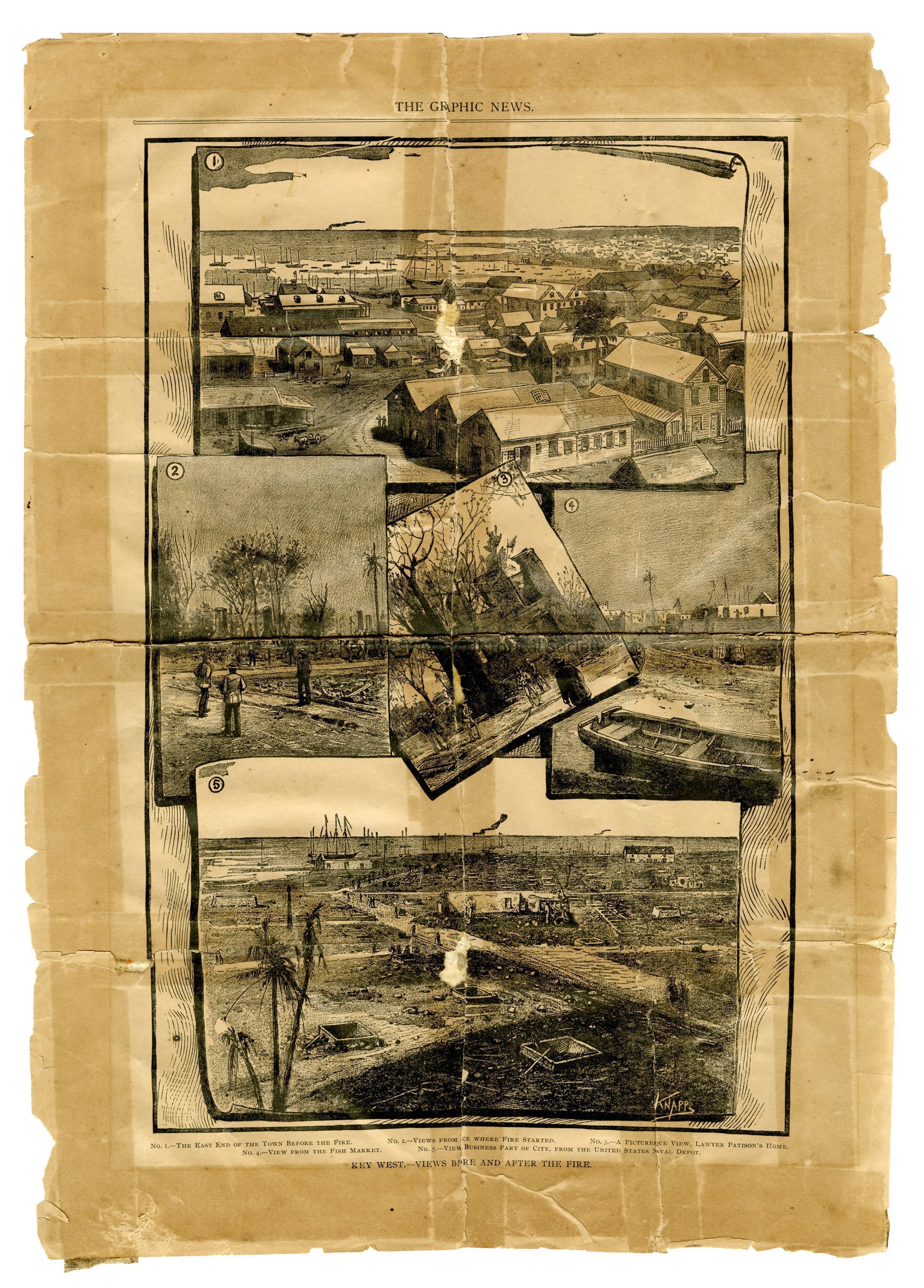 Five sketches of Key West on newsprint from The Graphic News by Knapp titled 'Key West - Views Before and After the Fire.' Published after the Great Fire of 1886 to demonstrate the destructiveness of the fire.