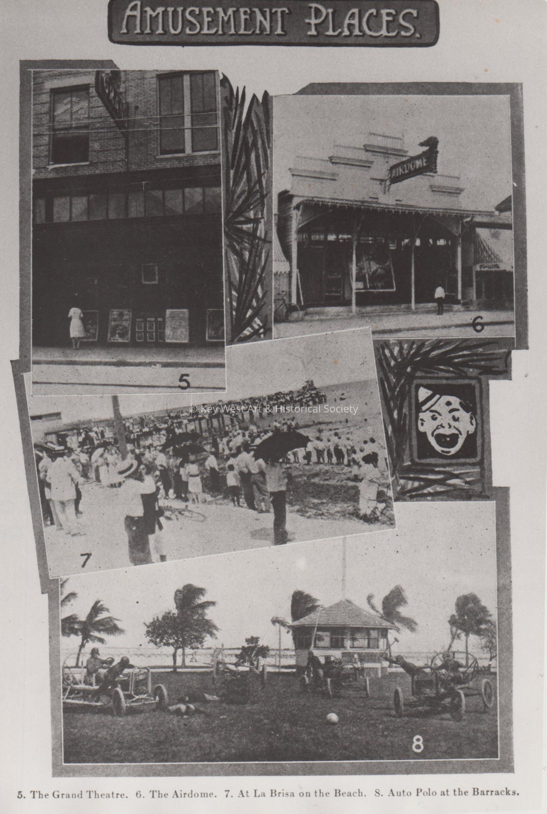 Black and white photograph collage of Key West's Amusement Places including The Grand Theatre, The Airdome, La Brisa on the Beach and Auto Polo at the Barracks.Collection