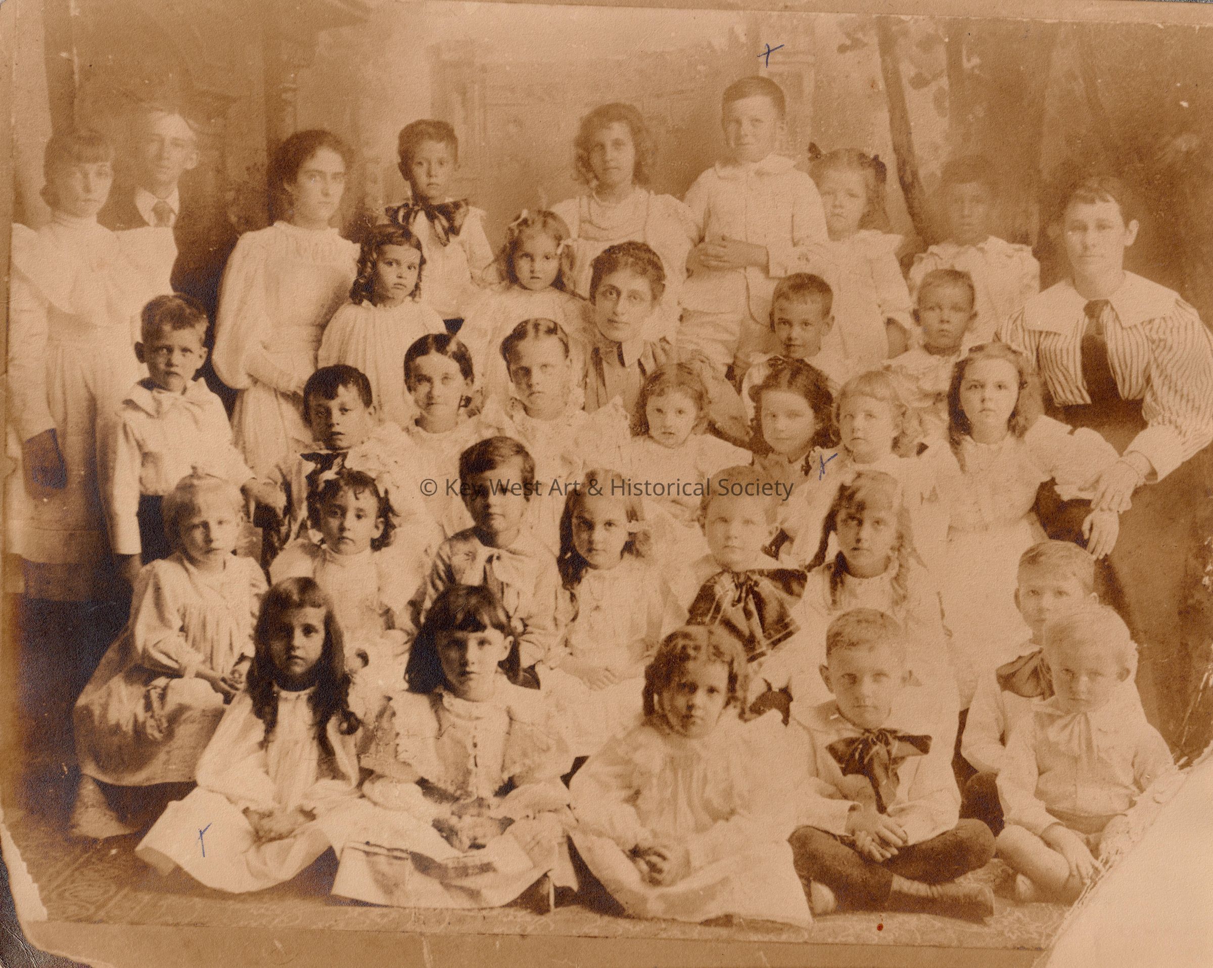 Photo of Kindergarten students and teachers at the Masonic Hall on Simonton Street, Key West, including Miss Moore, Maripole Otto, Elise Curry, Aunt Nellie, Alice or Florence Maloney, Fleur Williams, Auburn Paradais, Lynn Trasker, Robin Hovars, Isobelle Malvers, Janis Williams, Andrew Lewis Reedier, Mary Pendleton Godwin, and Jamie Williams Vicks, in 1895.Collection