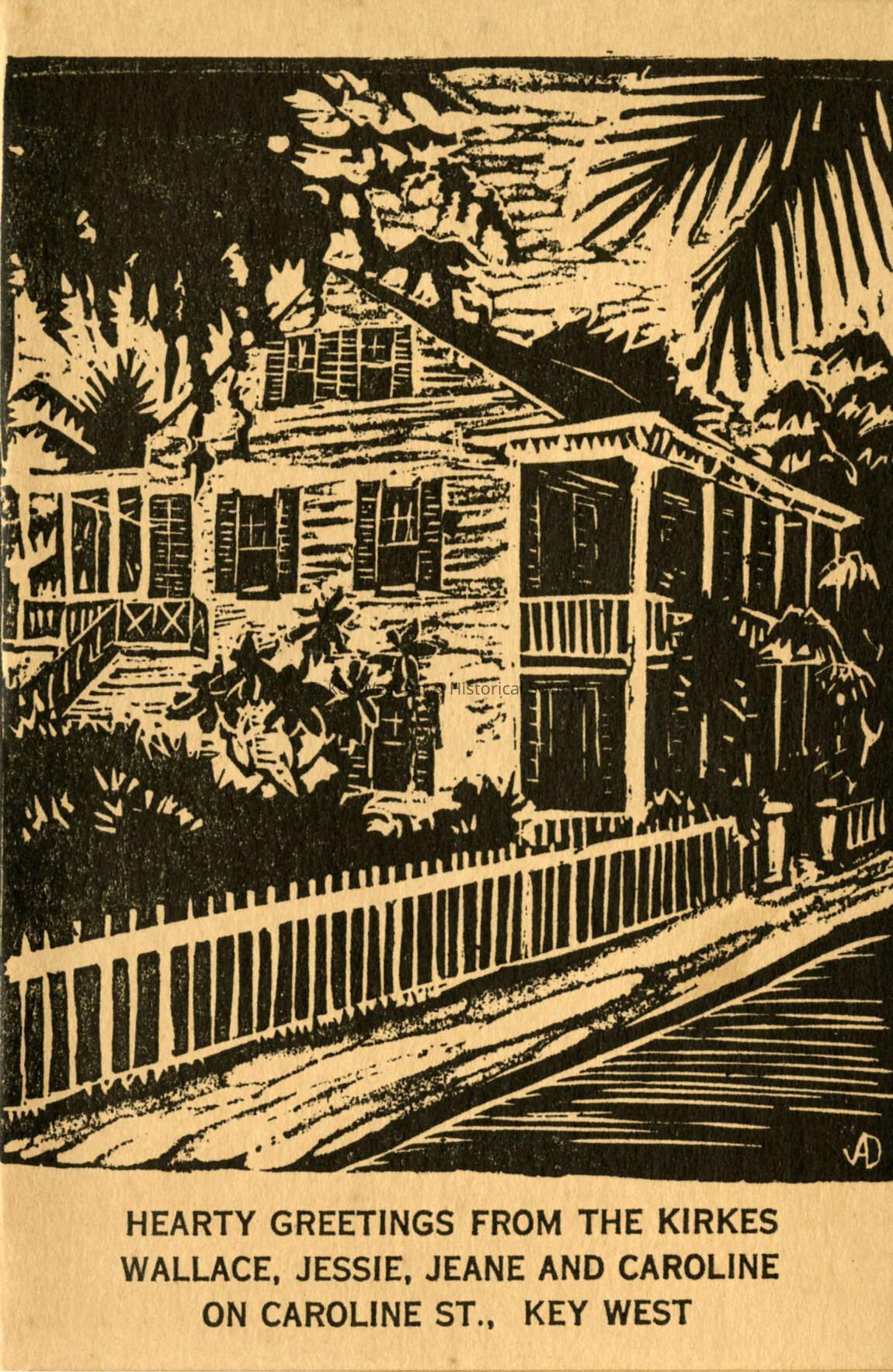 Linocut print folded note card depicting the Kirke house at 410 Caroline Street. Caption reads, 'Hearty Greetings from the Kirkes. Wallace, Jessie, Jeane and Caroline on Caroline St., Key West.'