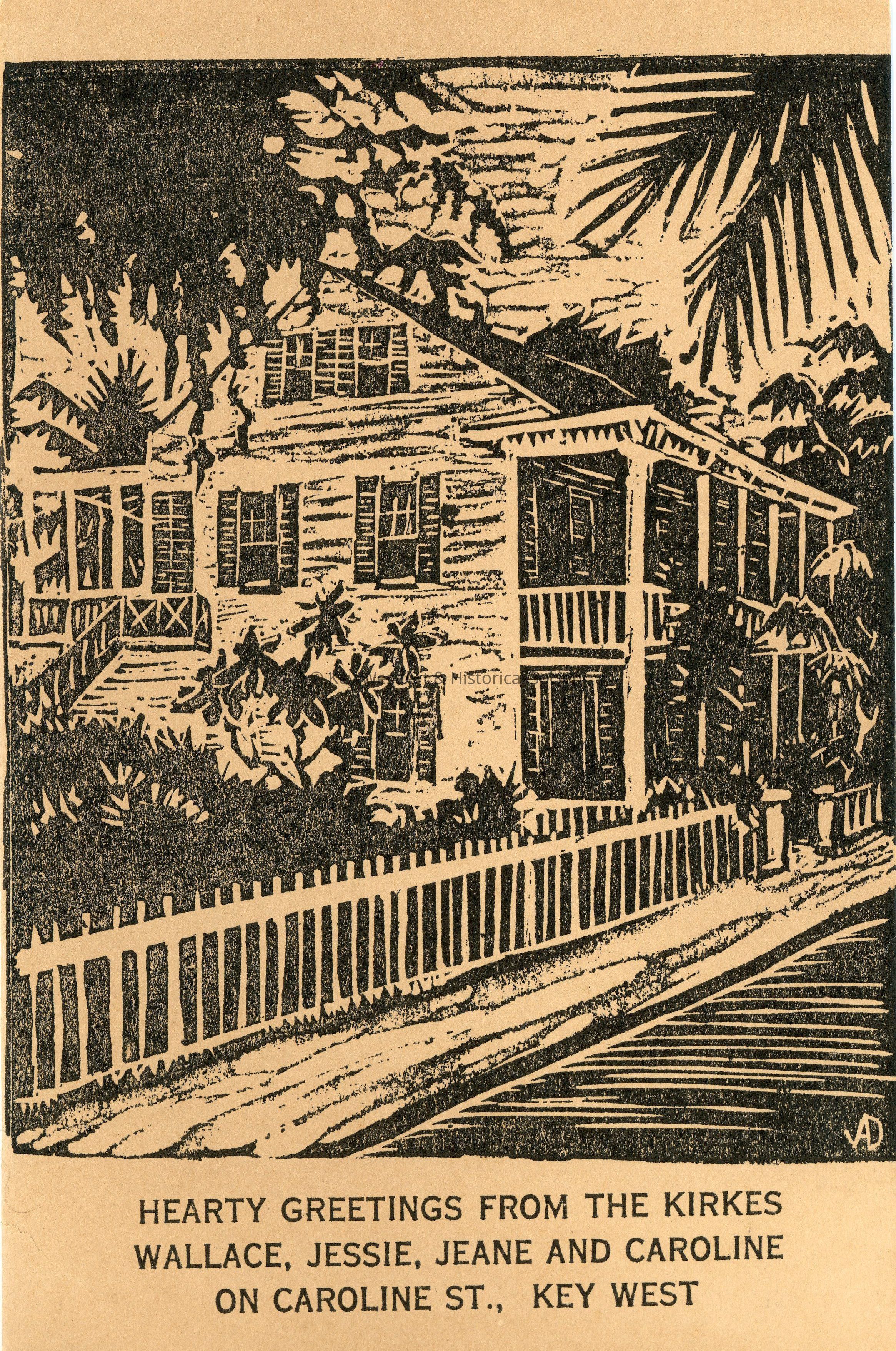 Linocut print folded note card depicting the Kirke house at 410 Caroline Street. Caption reads, 'Hearty Greetings from the Kirkes. Wallace, Jessie, Jeane and Caroline on Caroline St., Key West.'