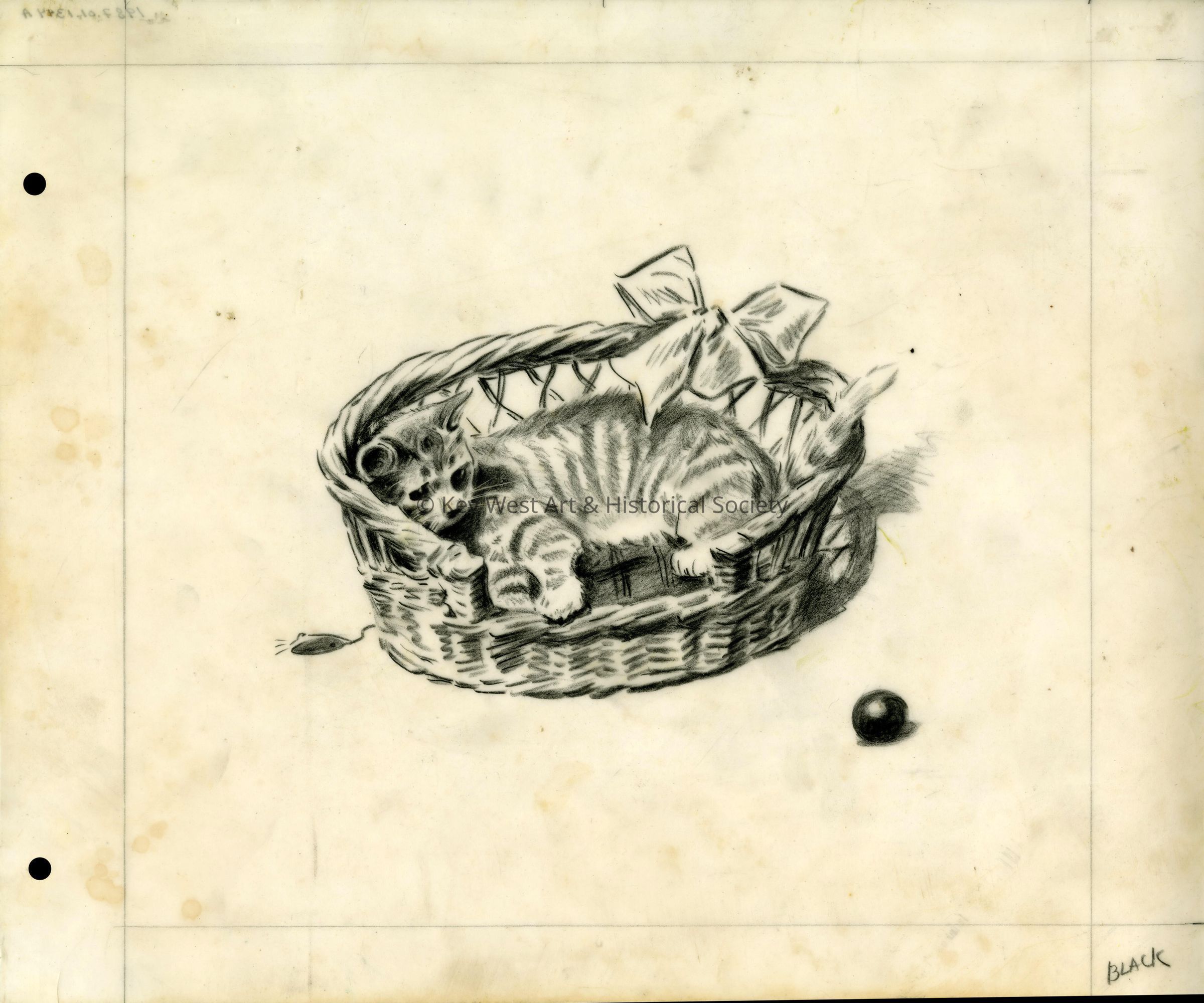 A charcoal sketch on vellum created by Morgan Dennis. The sketch is one of a series of color separations used in printing the book 'Kitten on the Keys'. This film is for the color Black.Type of Drawing