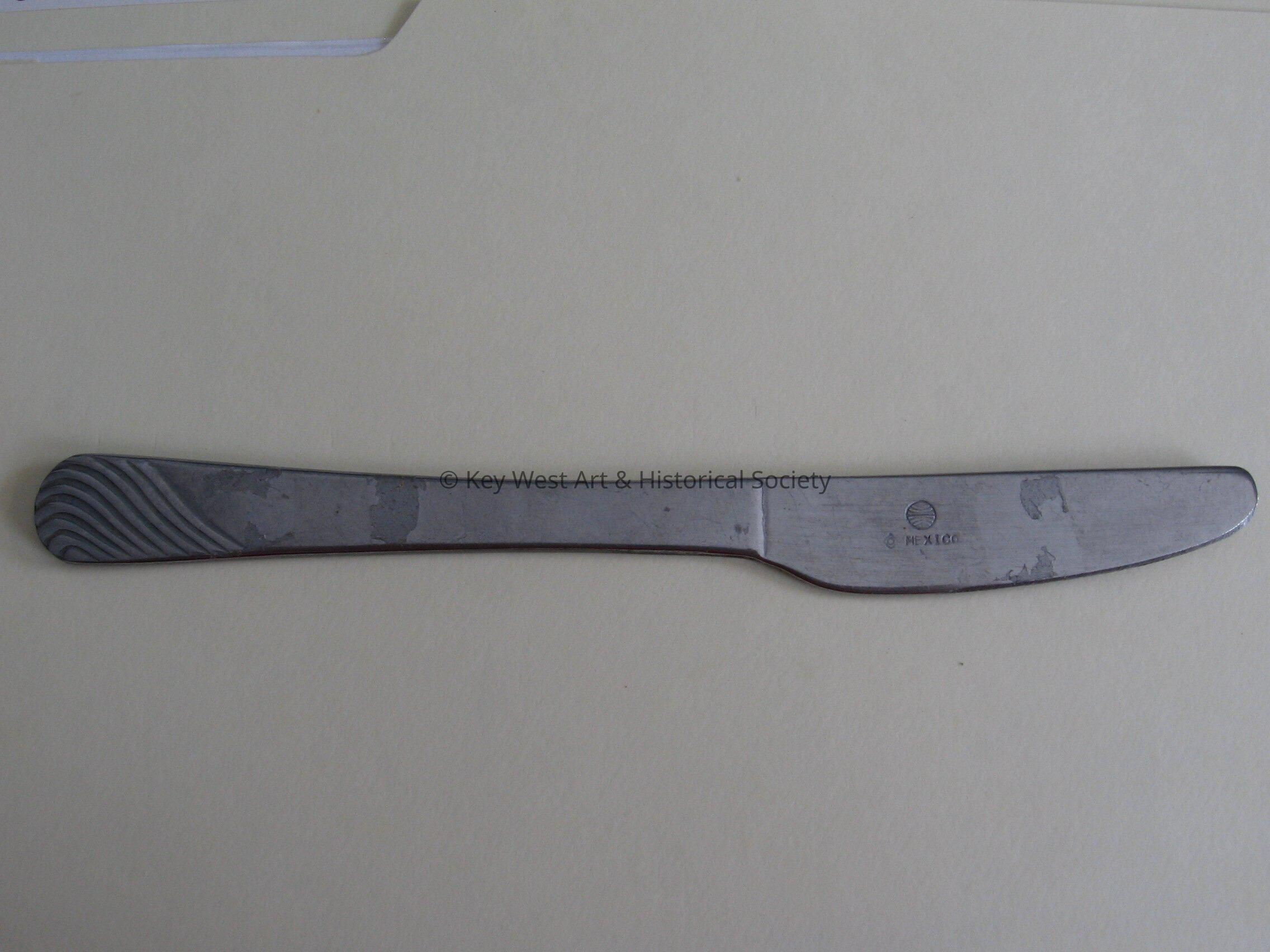 Stainless Steel dinner knife with Pan Am logo on the blade.