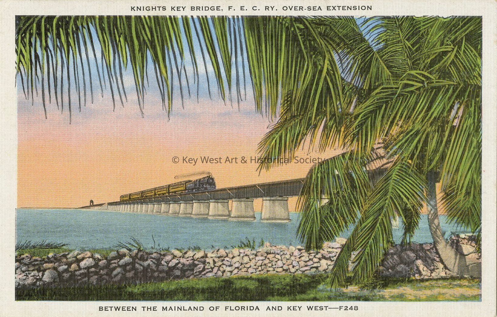 Postcard of Knights Key Bridge, F. E. C. RY. Over-Sea Extension between the mainland of Florida and Key West. Stretching almost seven miles across the opens sea, this is the longest bridge in the F. E. C. land of Florida and Key West. It consists of steel deck girders anchored on huge concrete piers. In this bridge there are 316 eighty-foot spans, 19 sixty-foot spans, finished off with 210 fifty-three foot concrete arches at the south end.Collection