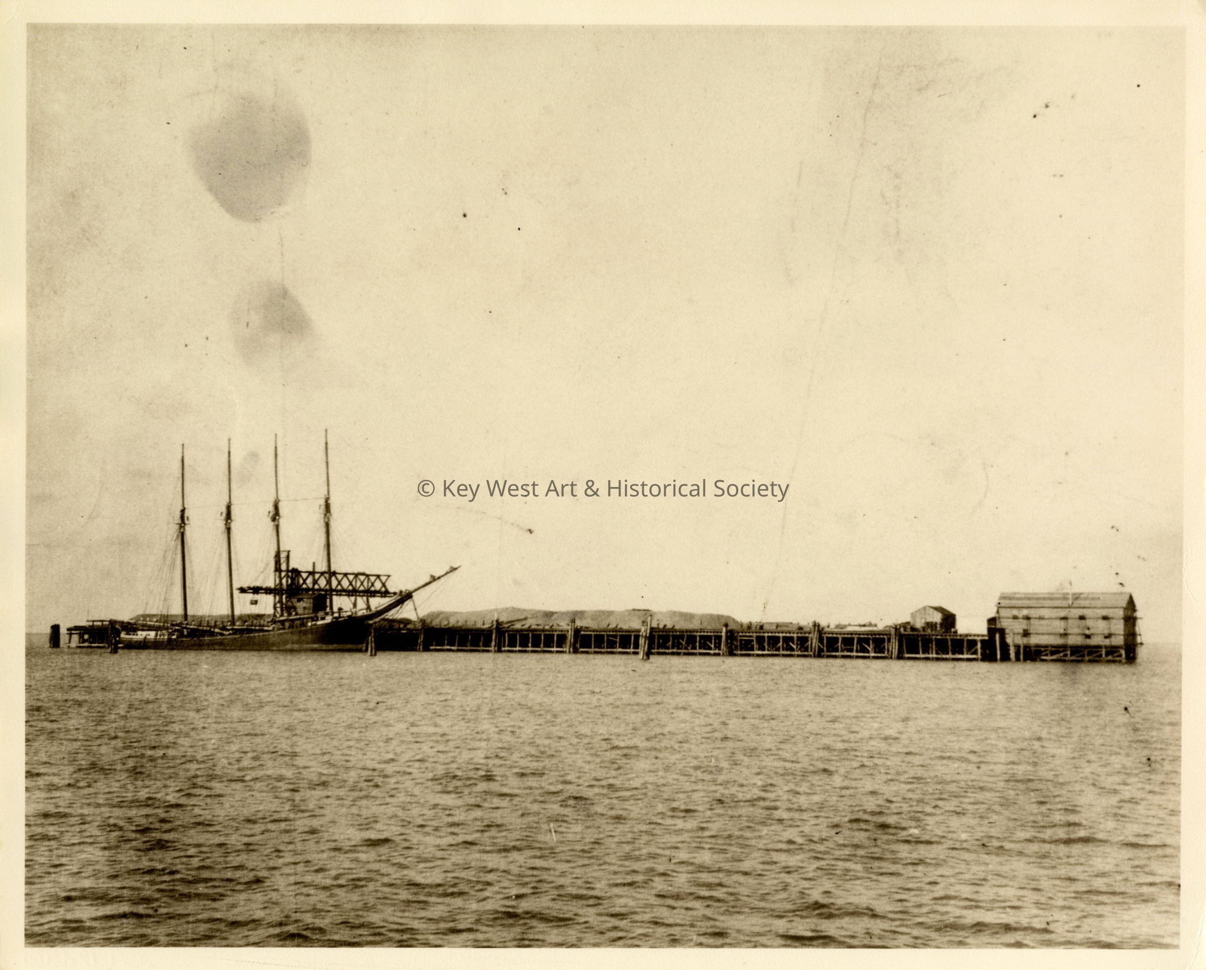 Black and white photograph of the schooner Ward alongside Knights Key dock.