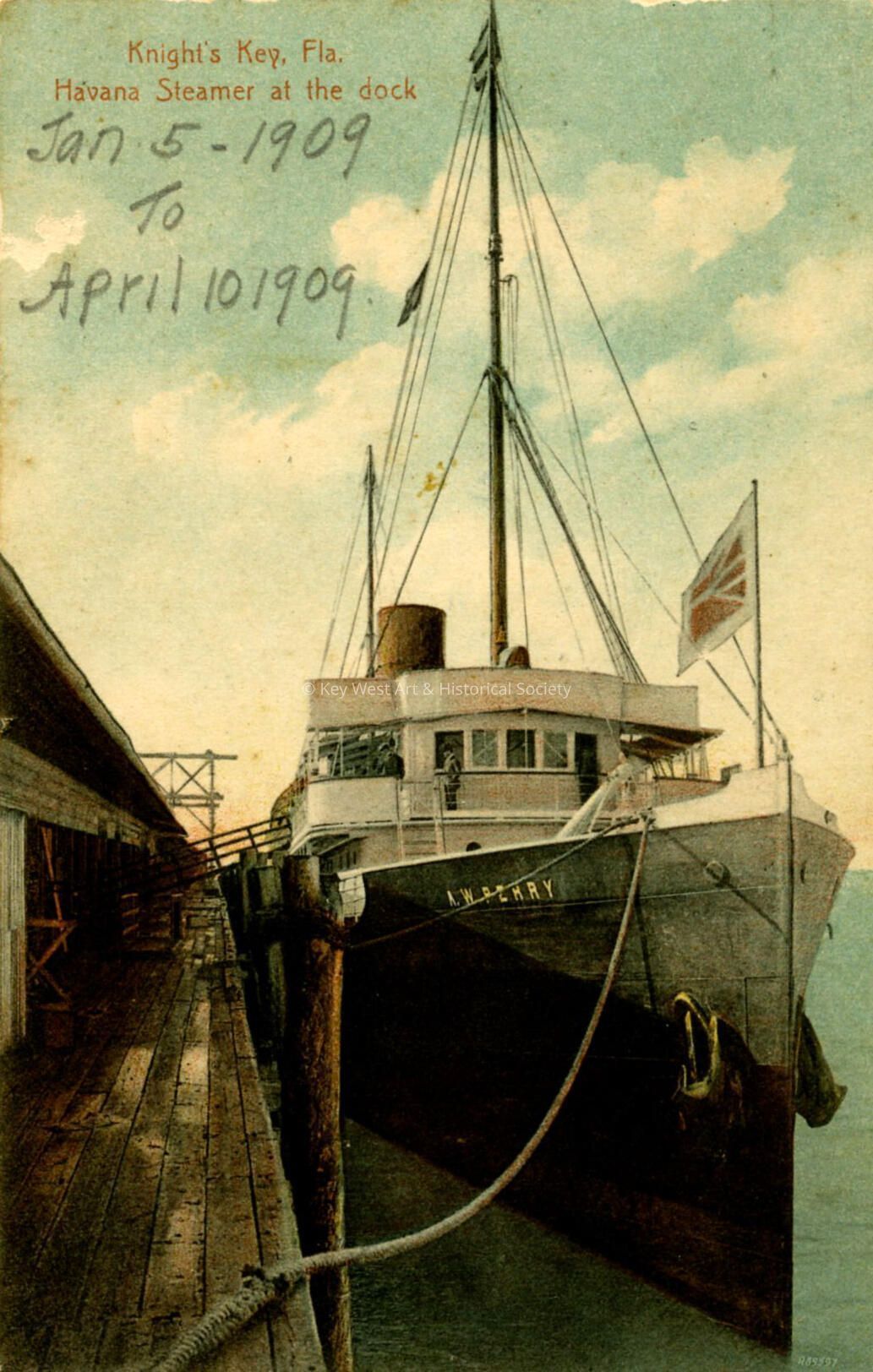 Postcard depicting a Cuban steam ship at Knights Key Dock. The caption reads, ‘Knight's Key, Fla. Havana Steamer at the dock.'Subject Person/Organization
