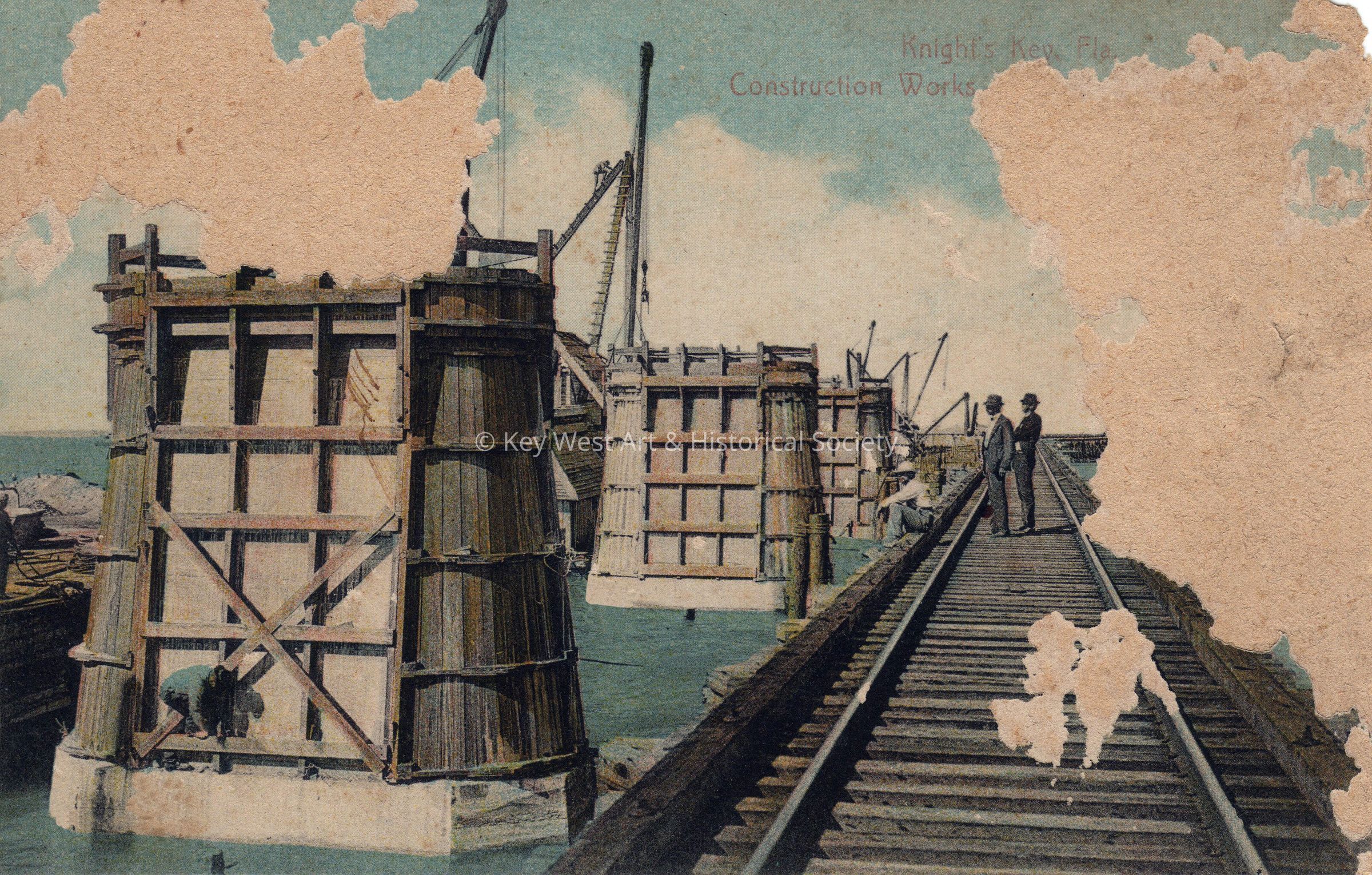 Postcard depicting men constructing the Seven Mile Bridge on the Florida East Coast Railway. The caption reads, ‘Knight's Key, Florida. Construction Work {illegible}’.Subject Person/Organization